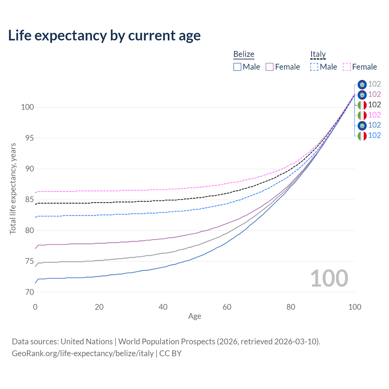 The average life expectancy at birth is 74.1 years in Belize vs 84.2 in Italy. Belize is ranked 102/197 by life expectancy, and Italy is 8/197. In Belize, the life expectancy is 71.4 years for males and 77 years for females. In Italy, it's 82.1 years for males and 86.1 years for females.