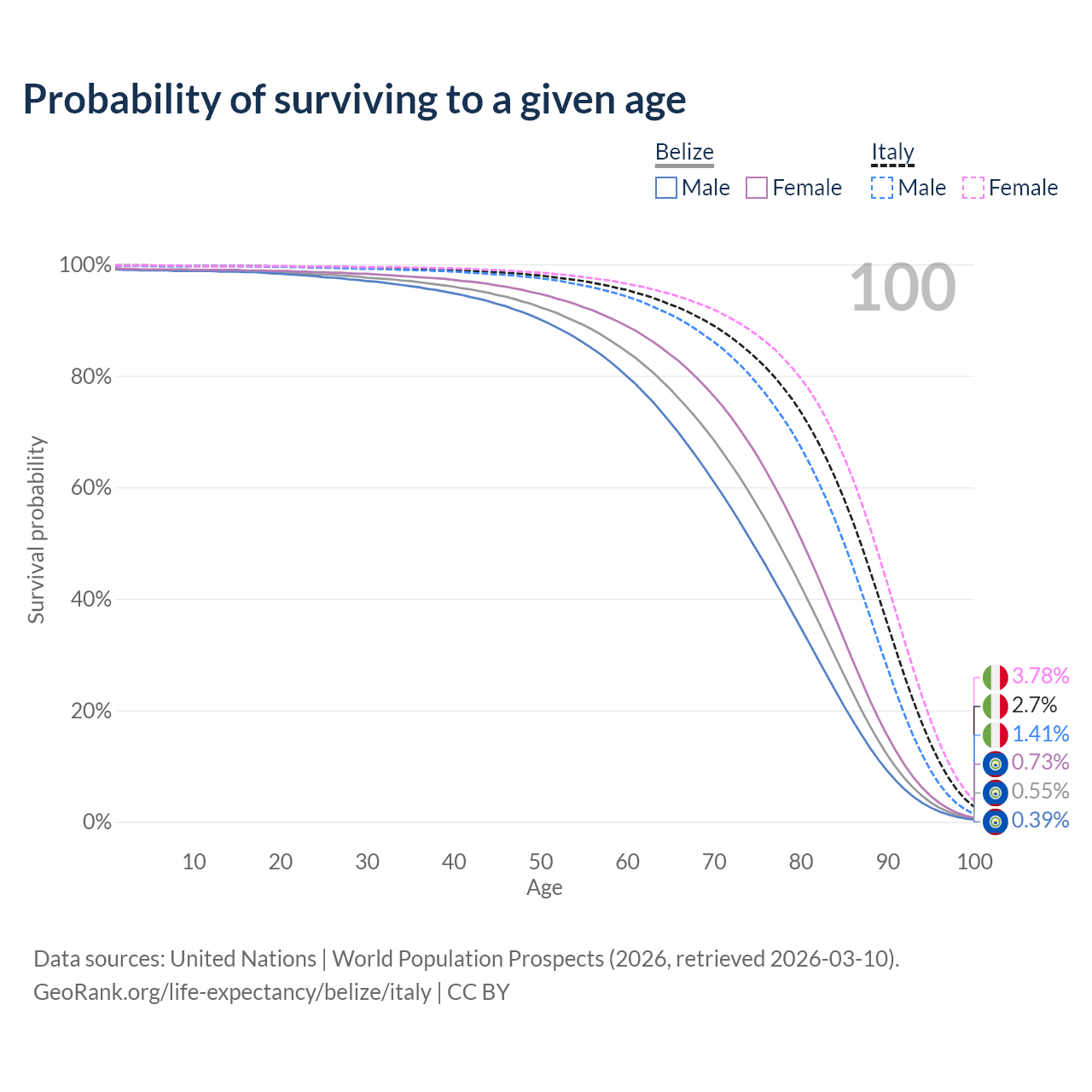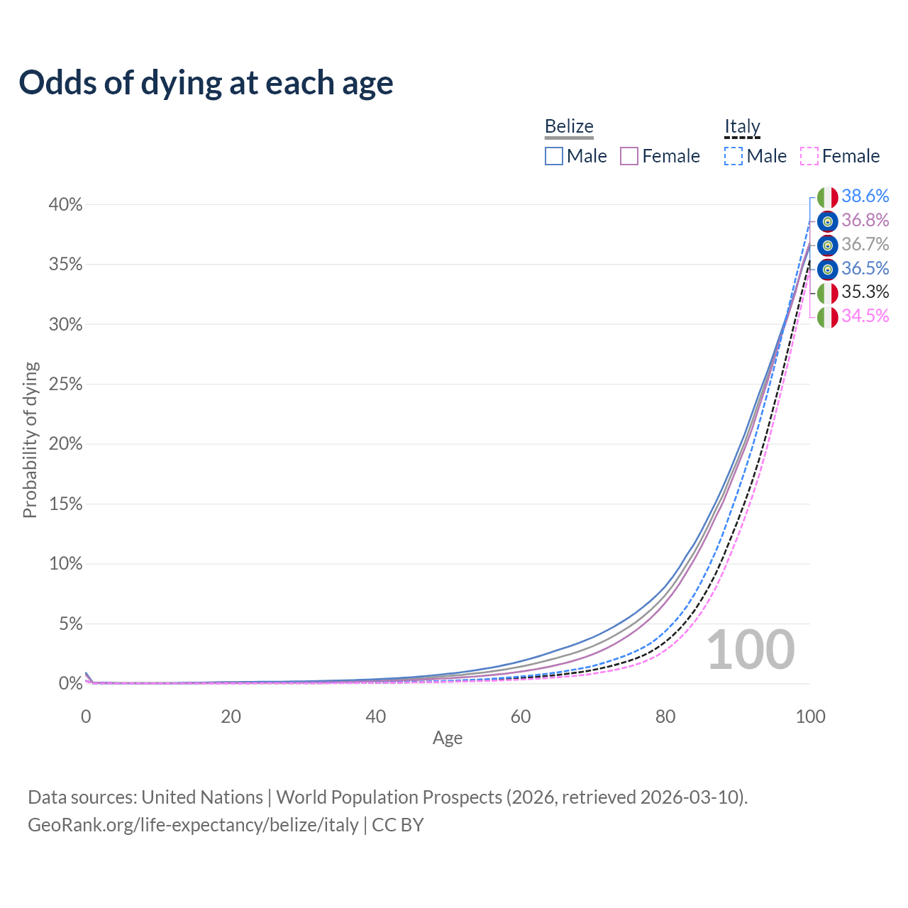 This life expectancy calculator shows the odds of living to 100, 95, 90, and below based on current age for both males and females in Belize and Italy, along with mean and median age of death. The calculations are based on the 2026 life tables (actuarial tables) from the UN World Population Prospects.
