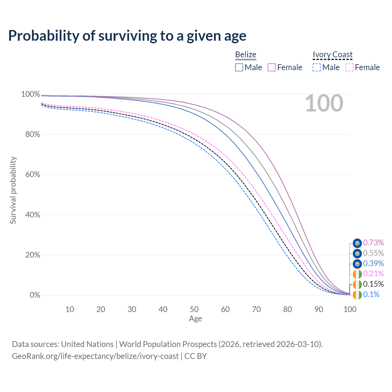 This life expectancy calculator shows the odds of living to 100, 95, 90, and below based on current age for both males and females in Belize and Ivory Coast, along with mean and median age of death. The calculations are based on the 2026 life tables (actuarial tables) from the UN World Population Prospects.