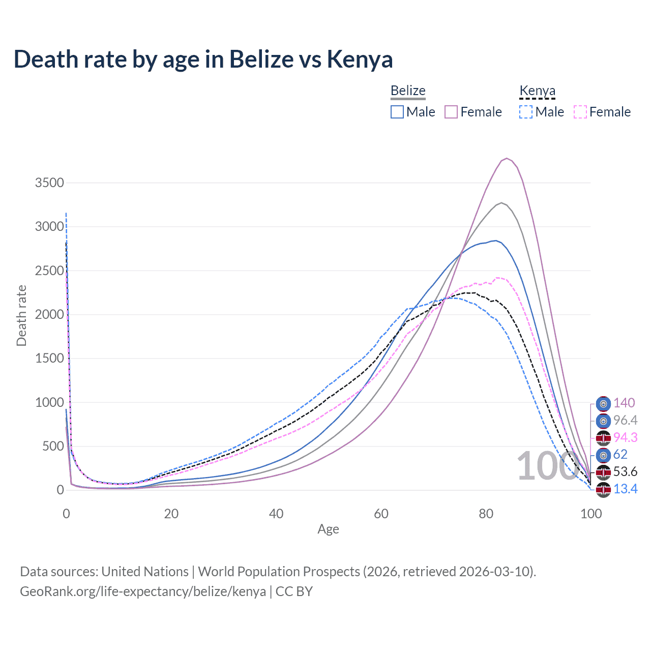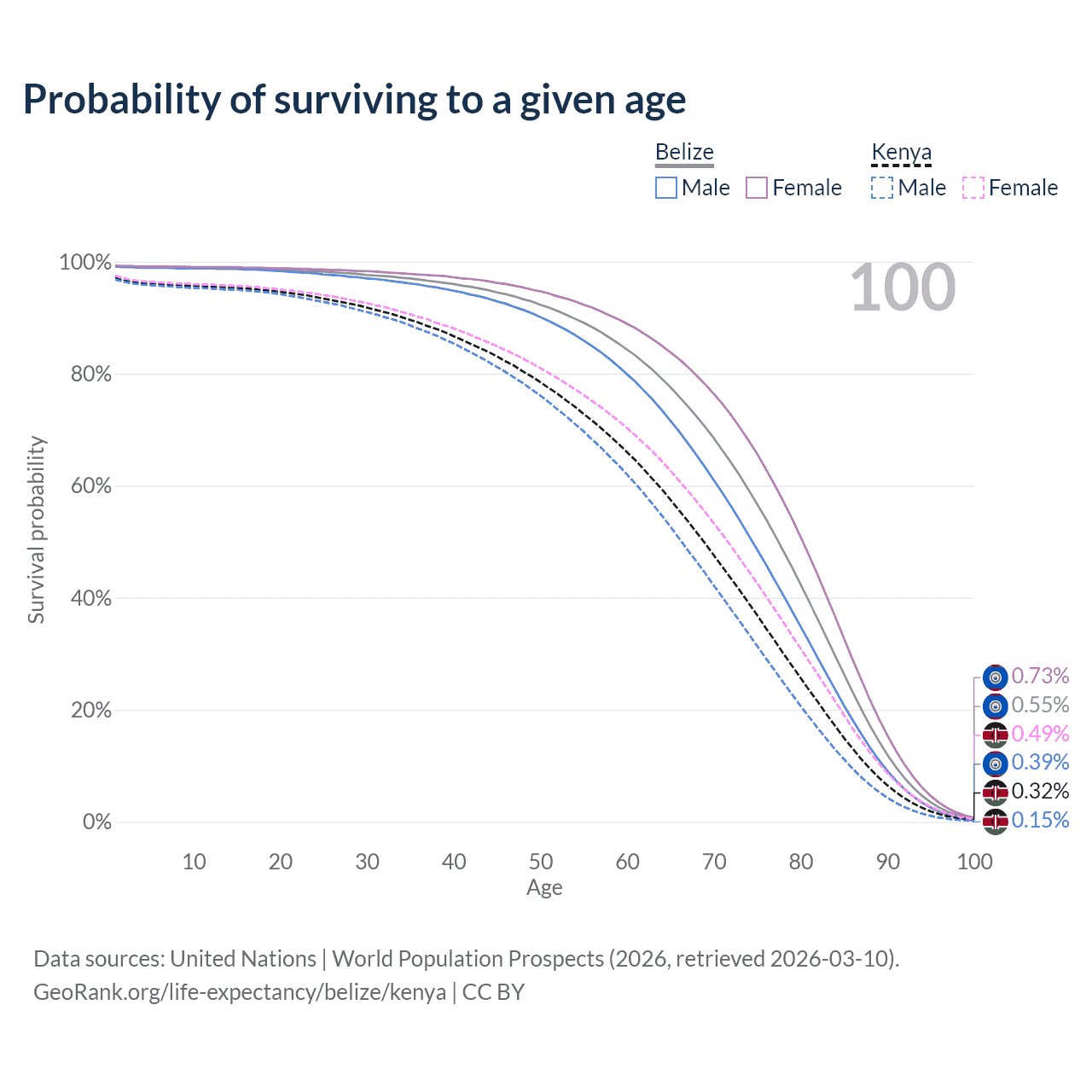 This life expectancy calculator shows the odds of living to 100, 95, 90, and below based on current age for both males and females in Belize and Kenya, along with mean and median age of death. The calculations are based on the 2026 life tables (actuarial tables) from the UN World Population Prospects.