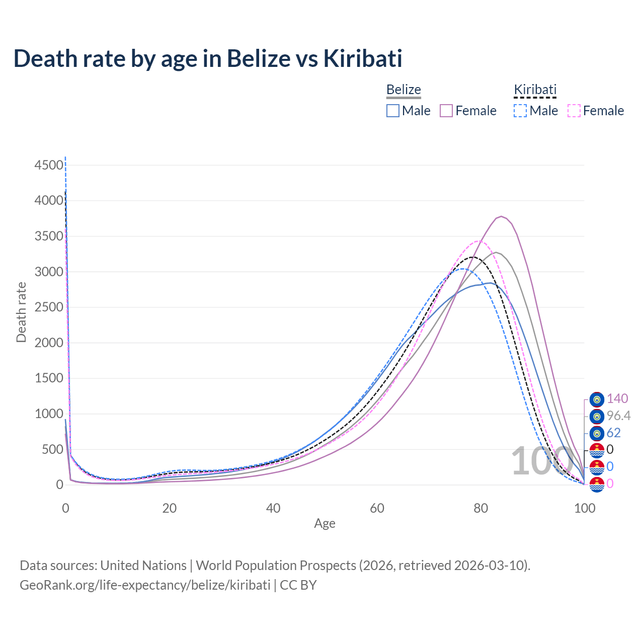 In Belize, the most common age of death is 83, compared to 0 in Kiribati. The median age of death is 77.5 in Belize and 73.1 in Kiribati, meaning only half of each cohort is expected to live past that age.