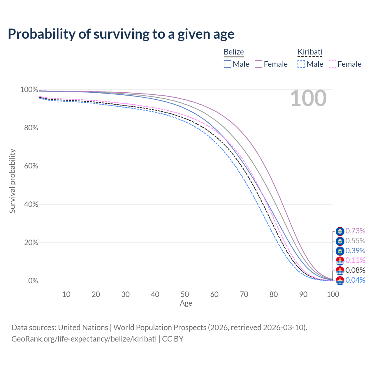 This life expectancy calculator shows the odds of living to 100, 95, 90, and below based on current age for both males and females in Belize and Kiribati, along with mean and median age of death. The calculations are based on the 2026 life tables (actuarial tables) from the UN World Population Prospects.