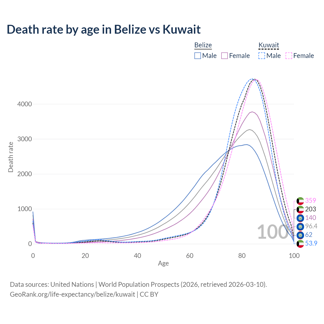 In Belize, the most common age of death is 83, compared to 85 in Kuwait. The median age of death is 77.5 in Belize and 83.3 in Kuwait, meaning only half of each cohort is expected to live past that age.