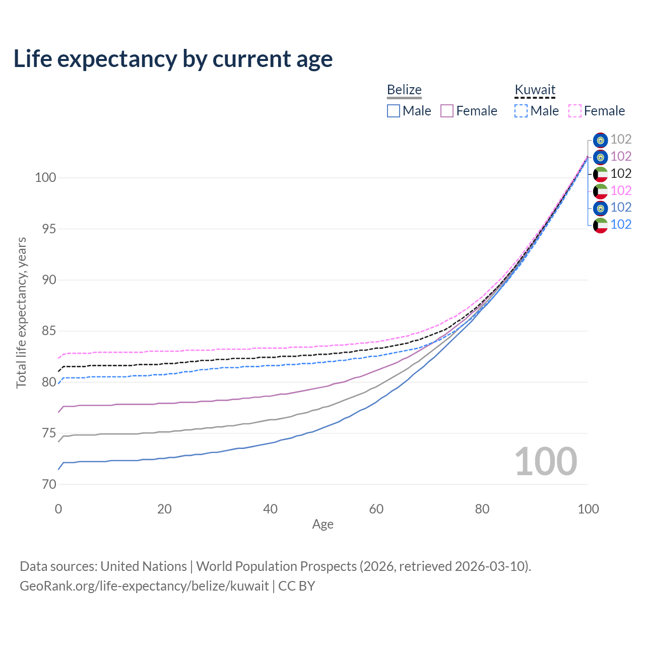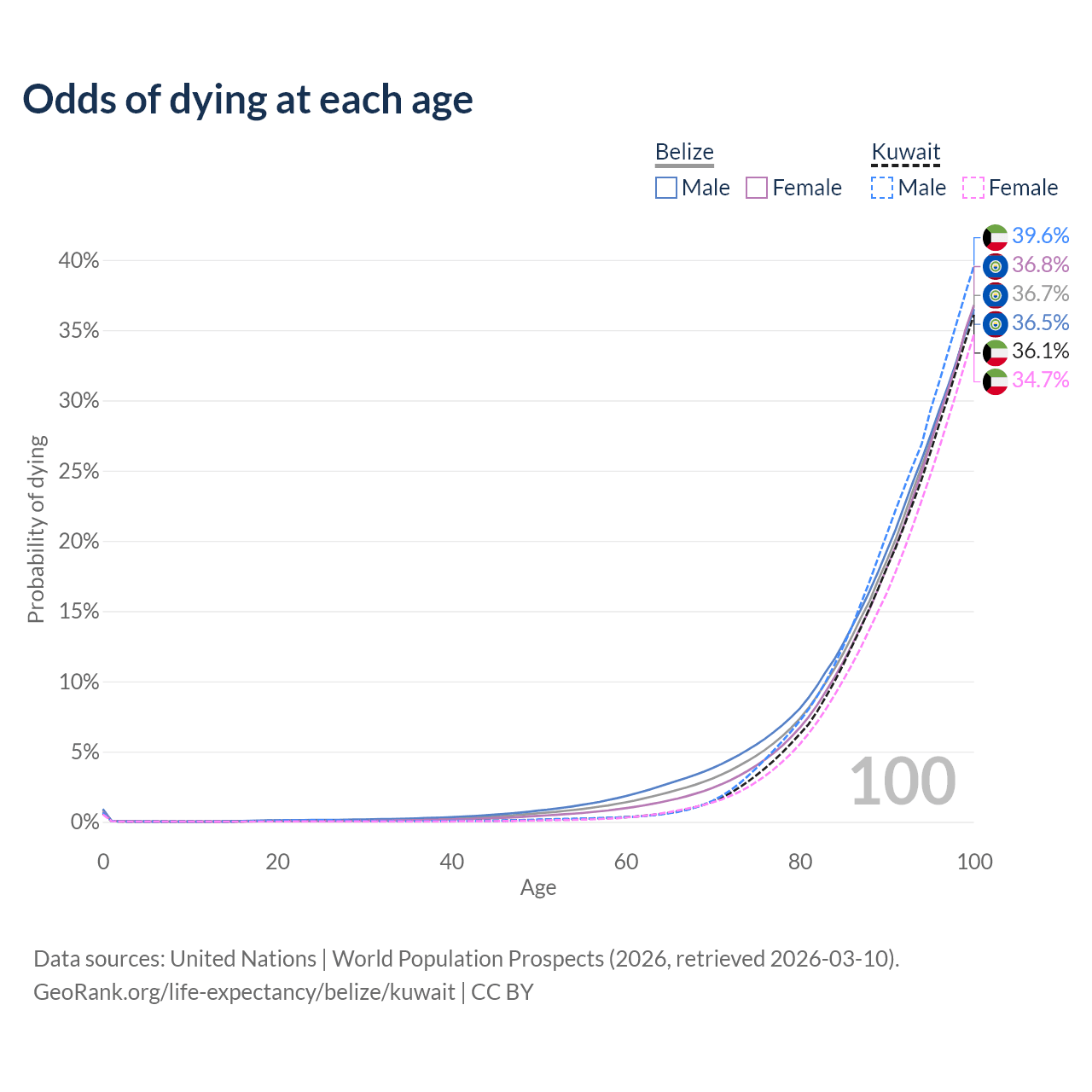 This life expectancy calculator shows the odds of living to 100, 95, 90, and below based on current age for both males and females in Belize and Kuwait, along with mean and median age of death. The calculations are based on the 2026 life tables (actuarial tables) from the UN World Population Prospects.