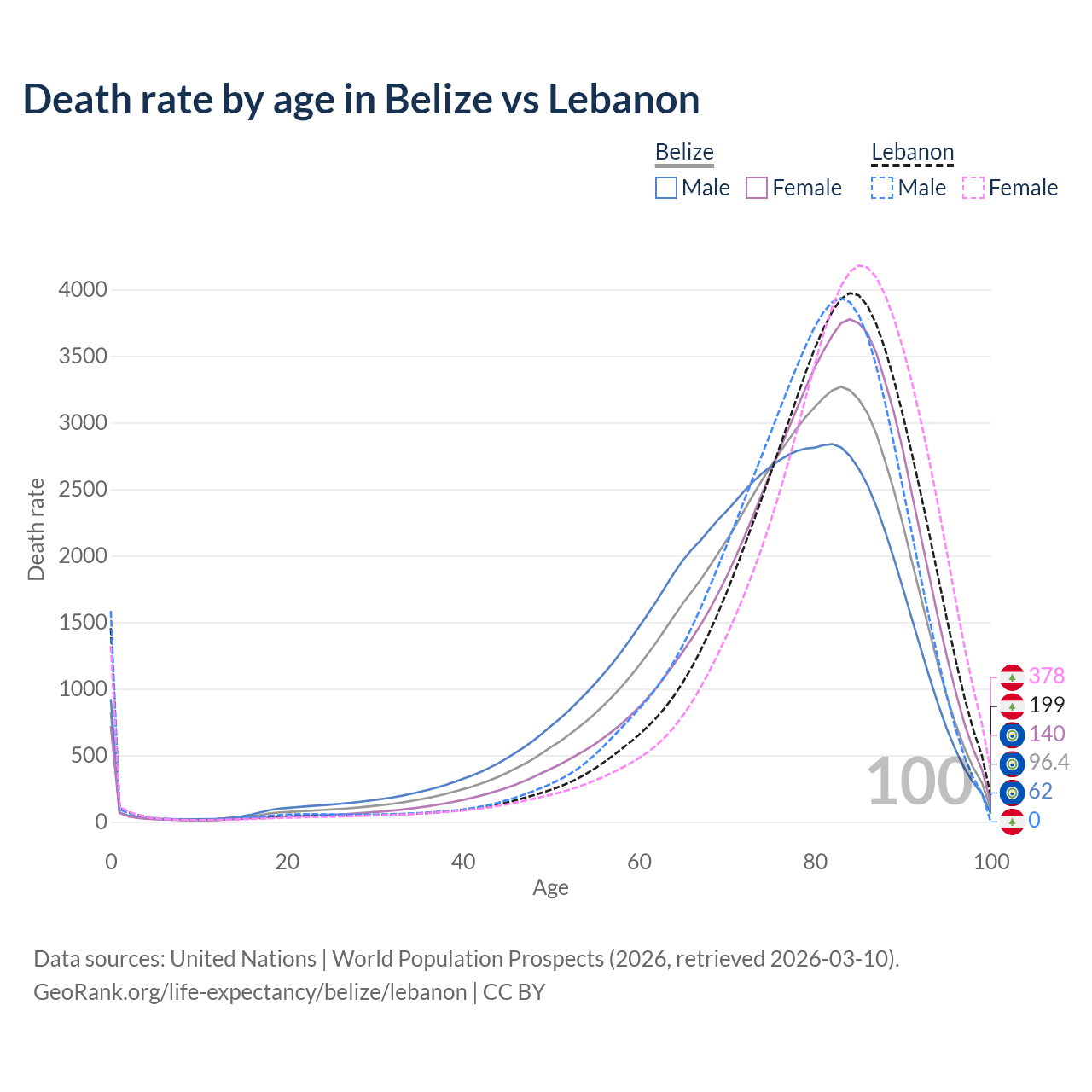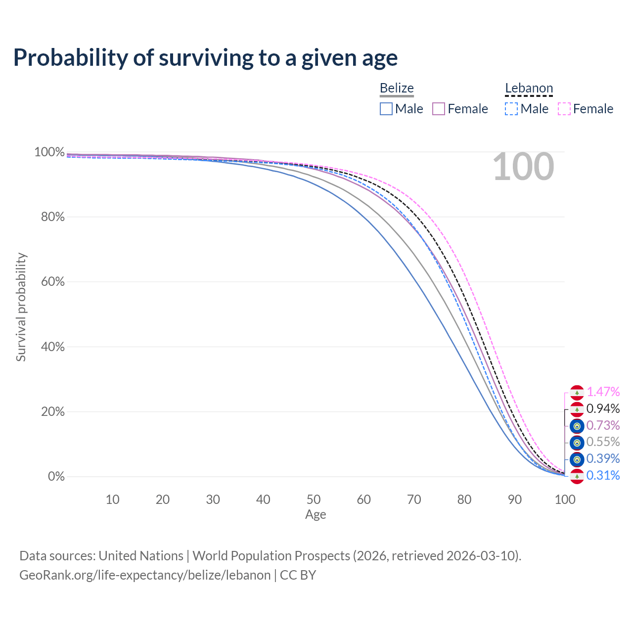 This life expectancy calculator shows the odds of living to 100, 95, 90, and below based on current age for both males and females in Belize and Lebanon, along with mean and median age of death. The calculations are based on the 2026 life tables (actuarial tables) from the UN World Population Prospects.