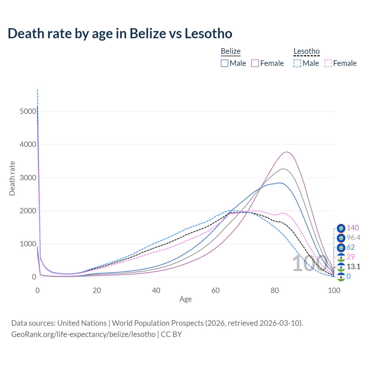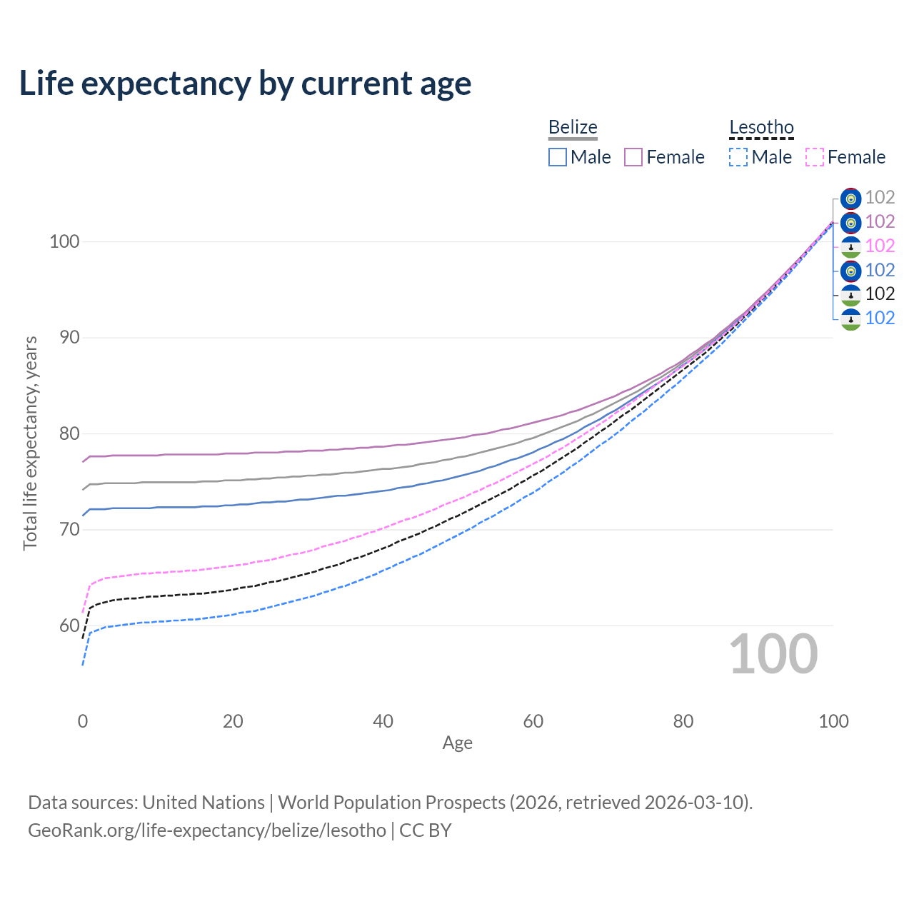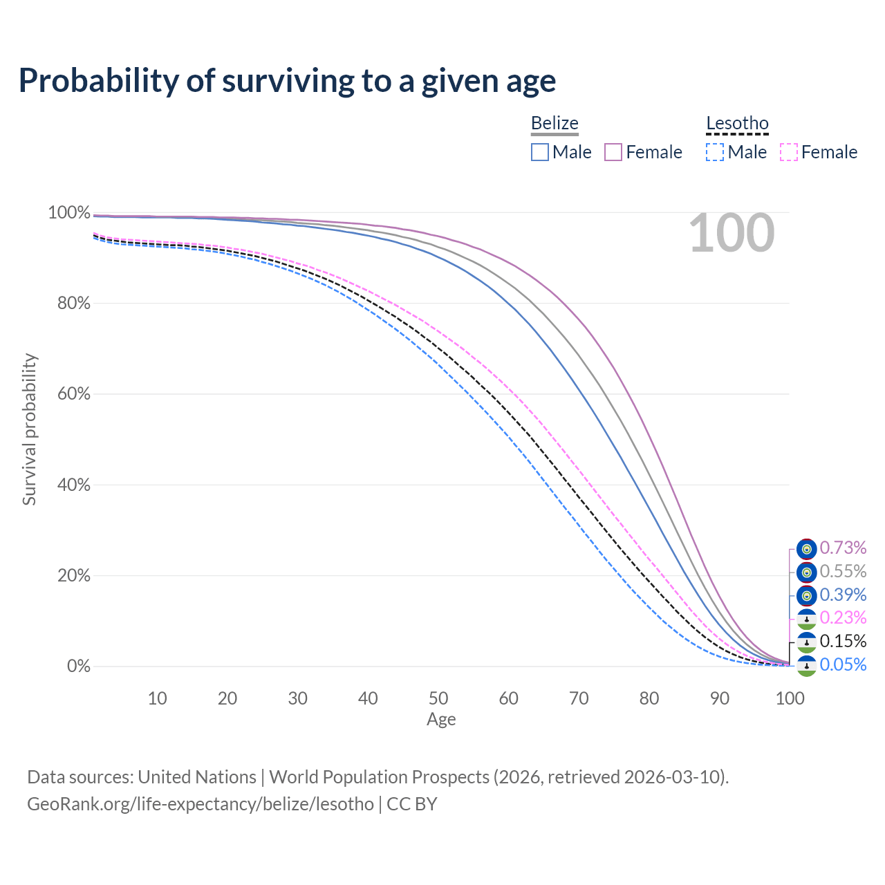 This life expectancy calculator shows the odds of living to 100, 95, 90, and below based on current age for both males and females in Belize and Lesotho, along with mean and median age of death. The calculations are based on the 2026 life tables (actuarial tables) from the UN World Population Prospects.