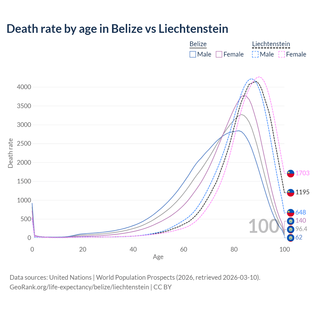 In Belize, the most common age of death is 83, compared to 89 in Liechtenstein. The median age of death is 77.5 in Belize and 86.3 in Liechtenstein, meaning only half of each cohort is expected to live past that age.