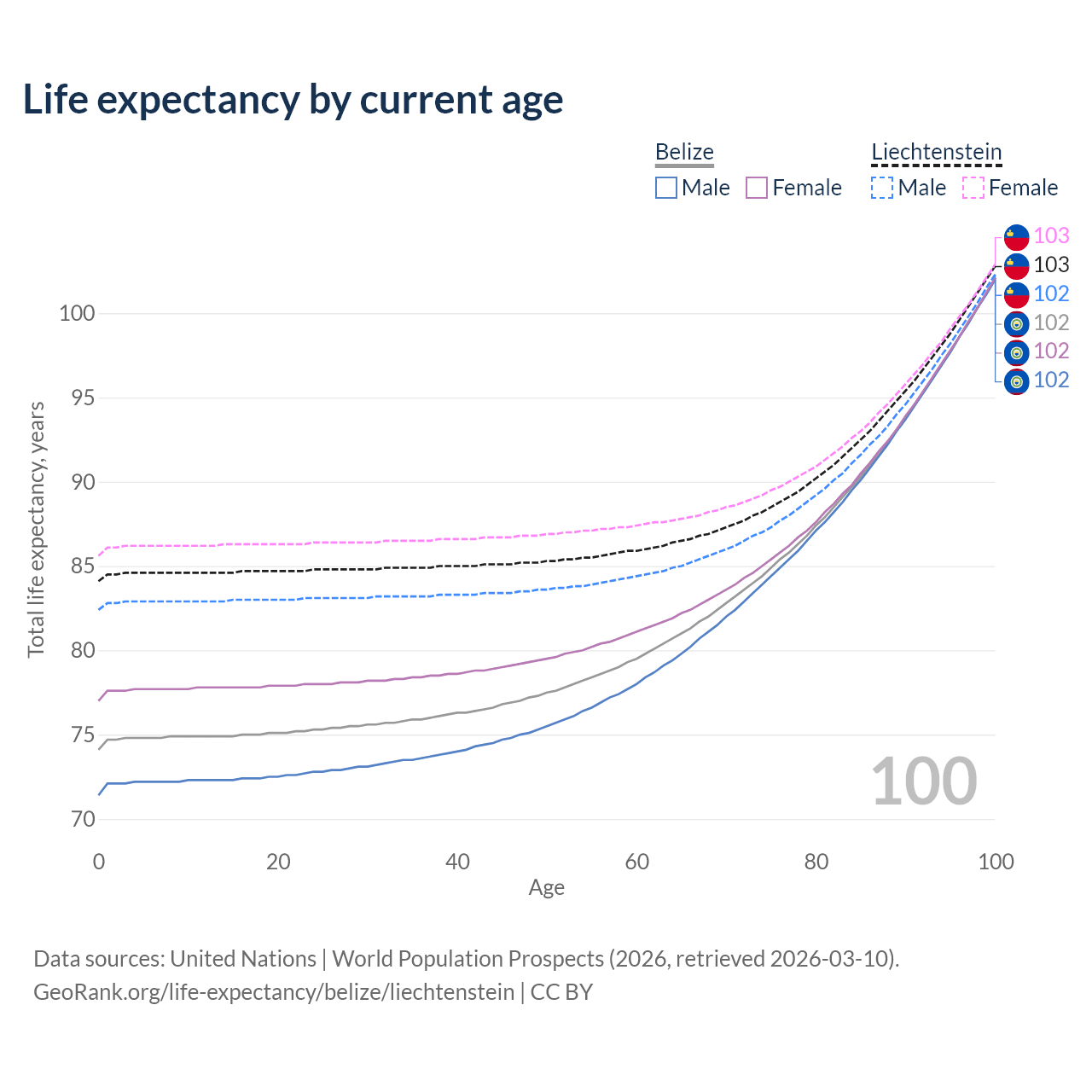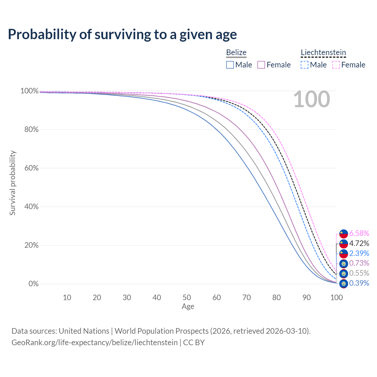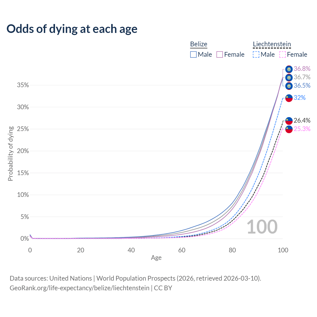 This life expectancy calculator shows the odds of living to 100, 95, 90, and below based on current age for both males and females in Belize and Liechtenstein, along with mean and median age of death. The calculations are based on the 2026 life tables (actuarial tables) from the UN World Population Prospects.