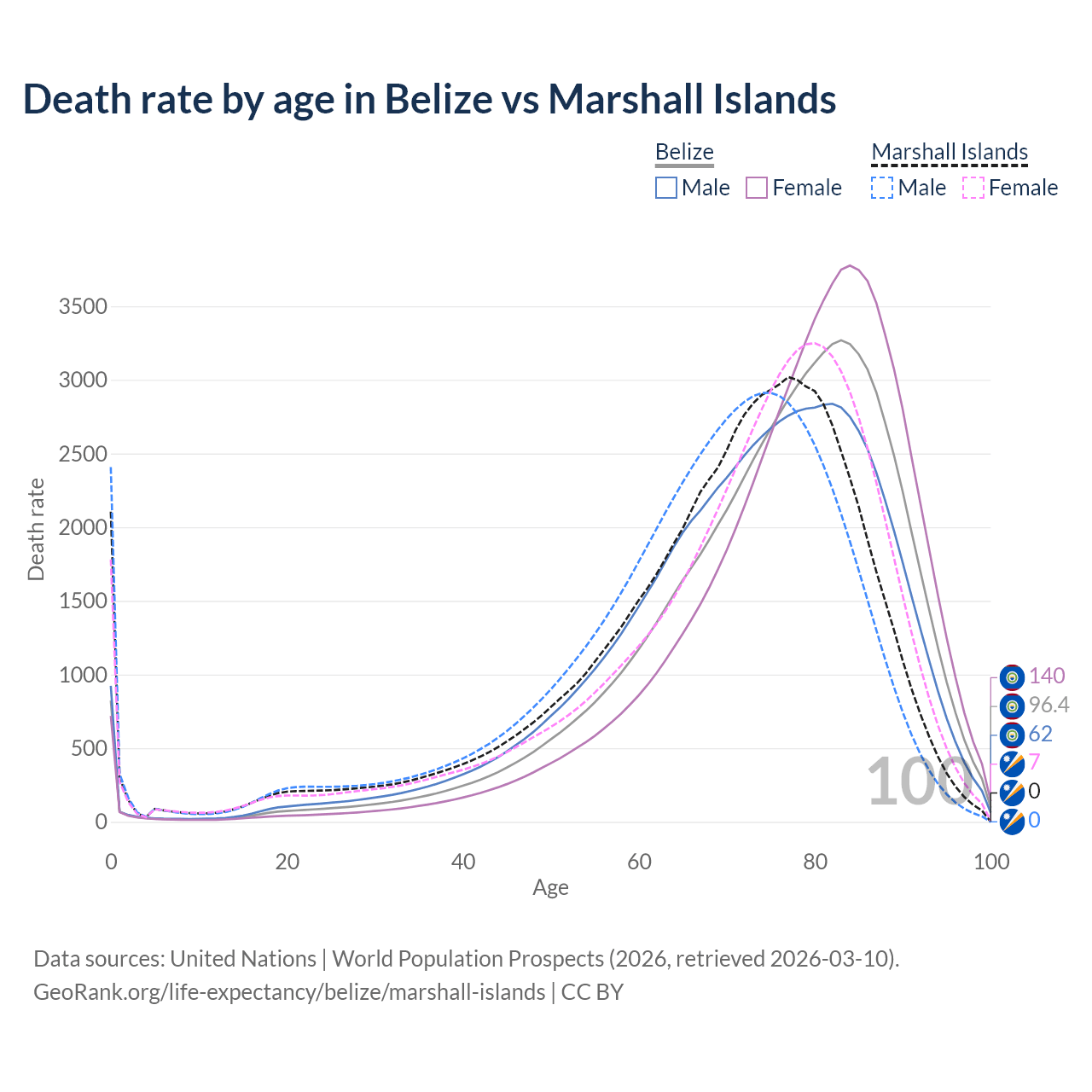 In Belize, the most common age of death is 83, compared to 77 in the Marshall Islands. The median age of death is 77.5 in Belize and 72 in the Marshall Islands, meaning only half of each cohort is expected to live past that age.