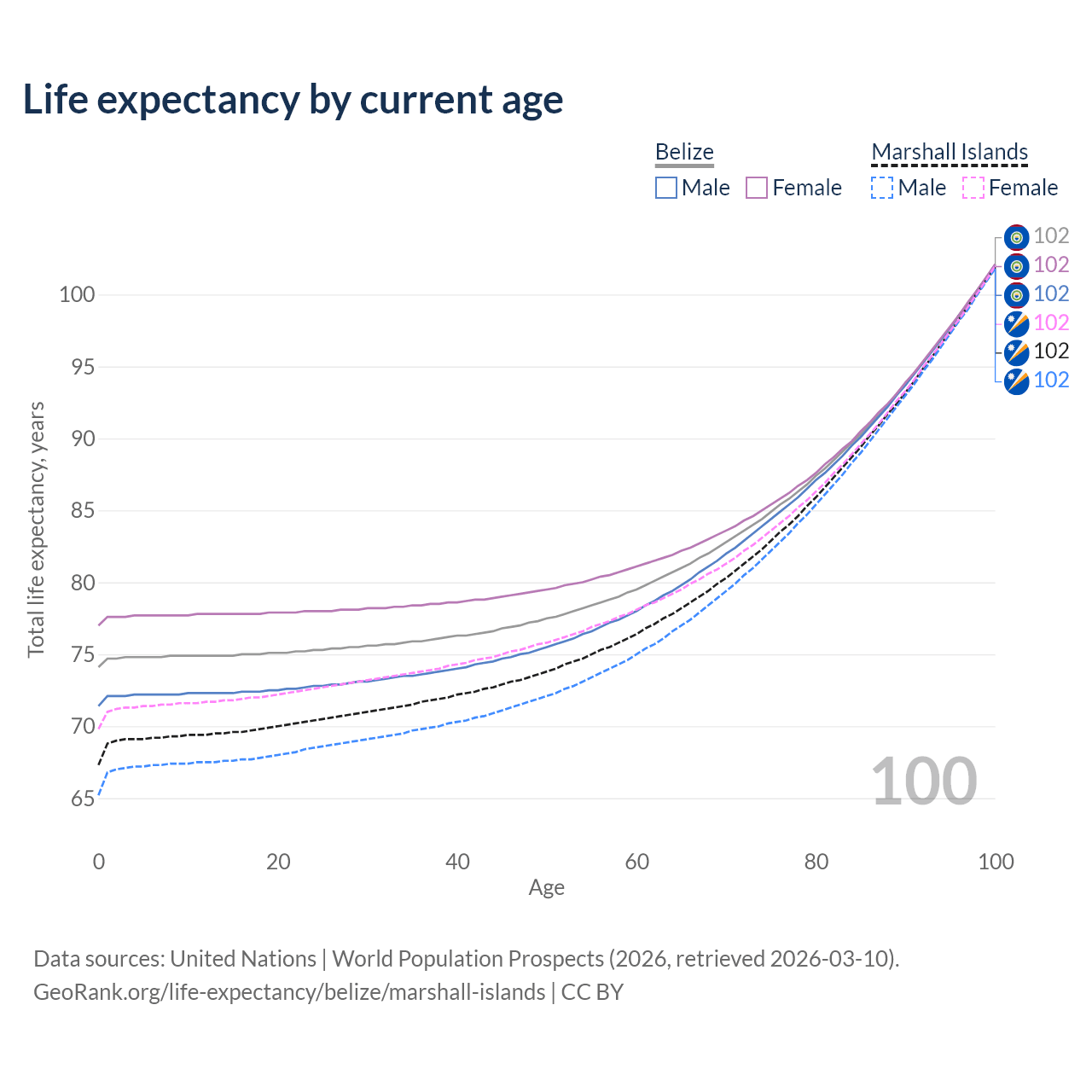 This life expectancy calculator shows the odds of living to 100, 95, 90, and below based on current age for both males and females in Belize and the Marshall Islands, along with mean and median age of death. The calculations are based on the 2026 life tables (actuarial tables) from the UN World Population Prospects.