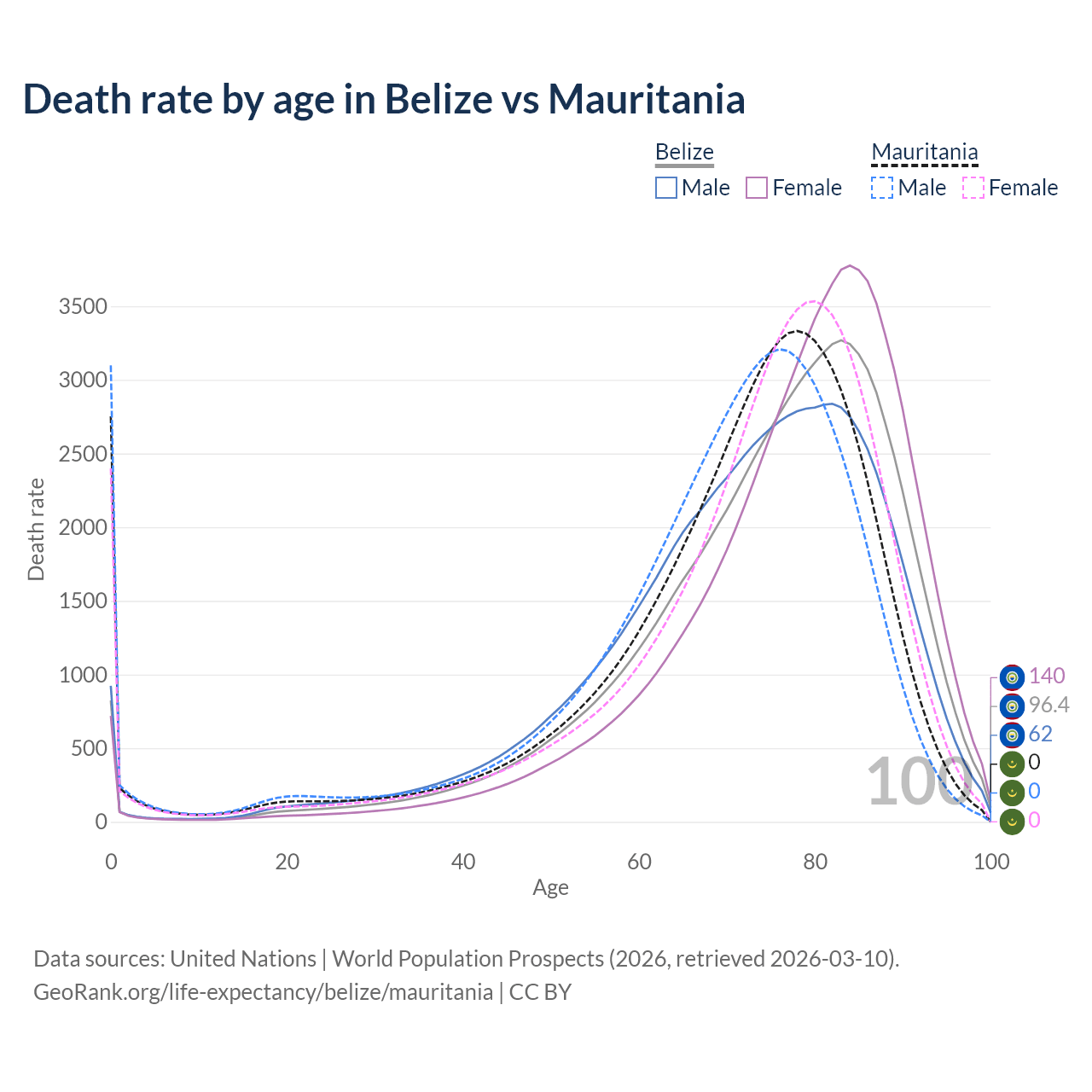 In Belize, the most common age of death is 83, compared to 78 in Mauritania. The median age of death is 77.5 in Belize and 74.1 in Mauritania, meaning only half of each cohort is expected to live past that age.