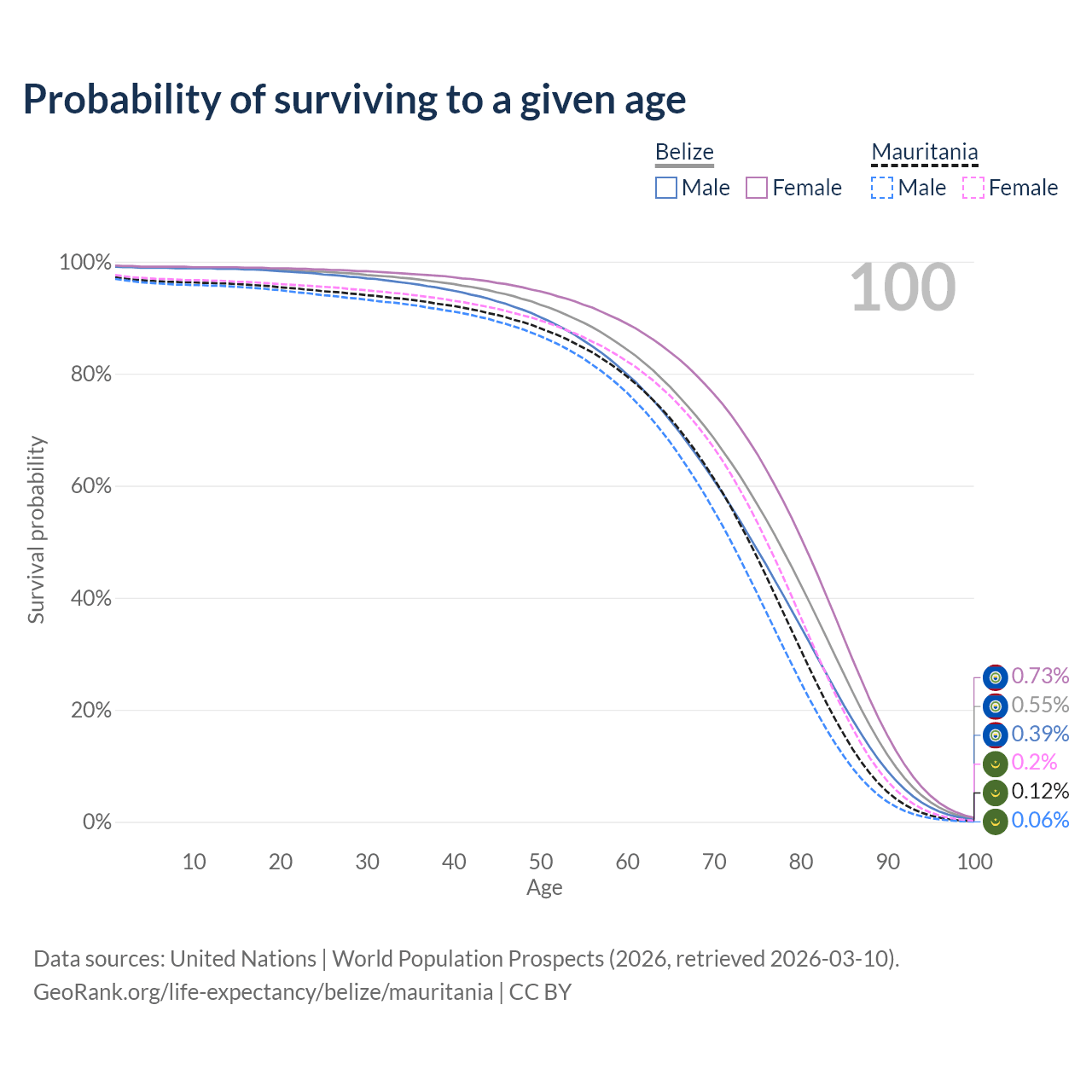 This life expectancy calculator shows the odds of living to 100, 95, 90, and below based on current age for both males and females in Belize and Mauritania, along with mean and median age of death. The calculations are based on the 2026 life tables (actuarial tables) from the UN World Population Prospects.