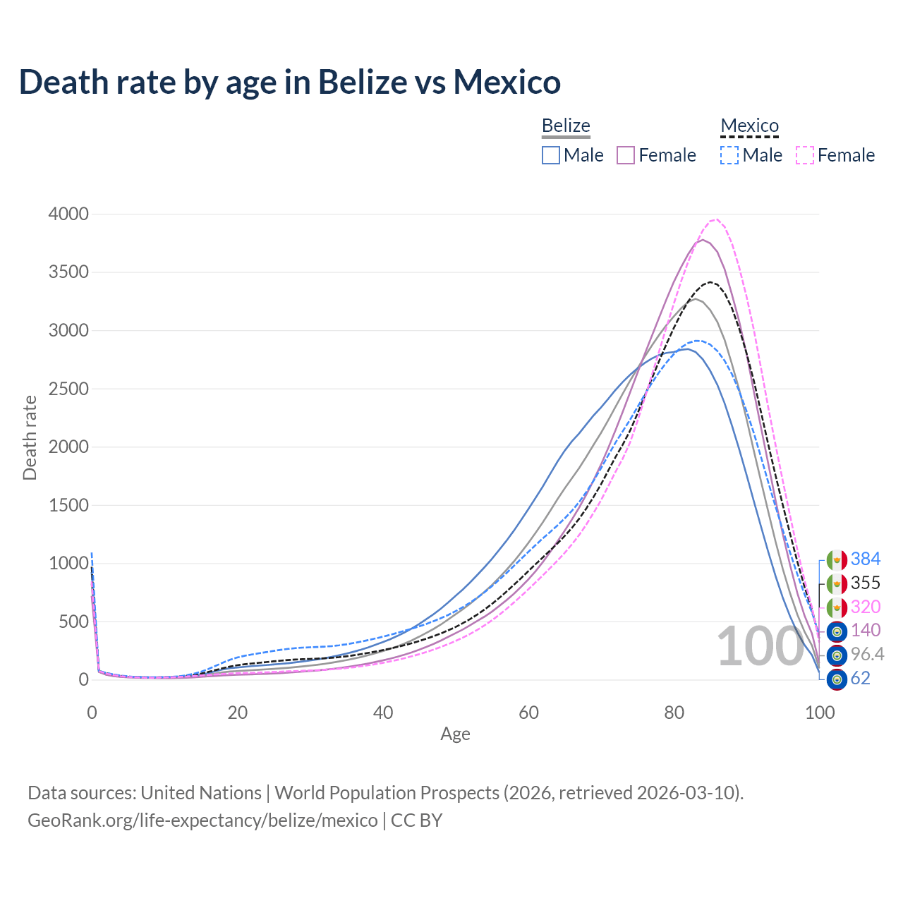 In Belize, the most common age of death is 83, compared to 85 in Mexico. The median age of death is 77.5 in Belize and 80.1 in Mexico, meaning only half of each cohort is expected to live past that age.