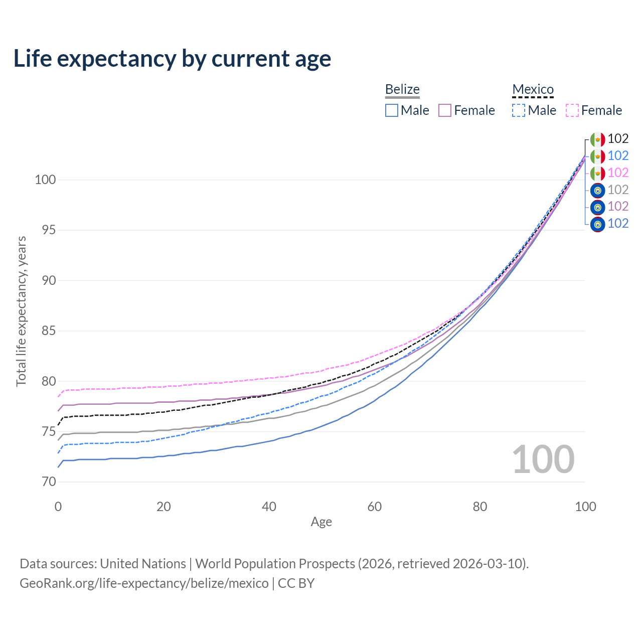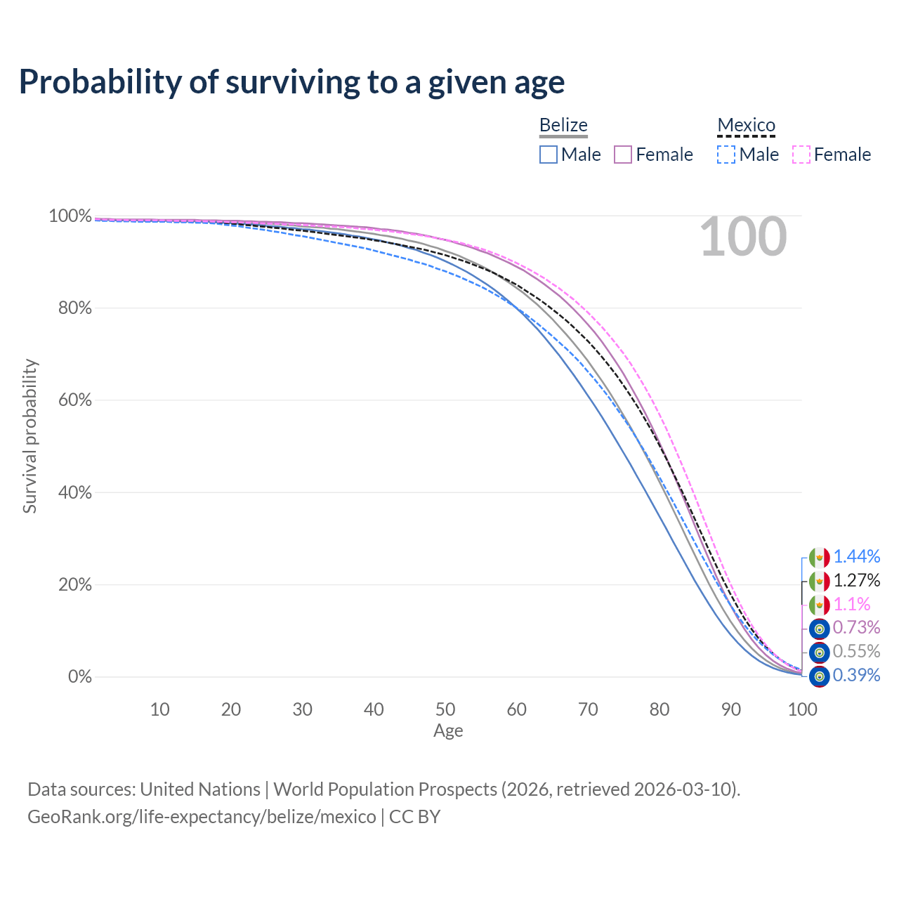This life expectancy calculator shows the odds of living to 100, 95, 90, and below based on current age for both males and females in Belize and Mexico, along with mean and median age of death. The calculations are based on the 2026 life tables (actuarial tables) from the UN World Population Prospects.