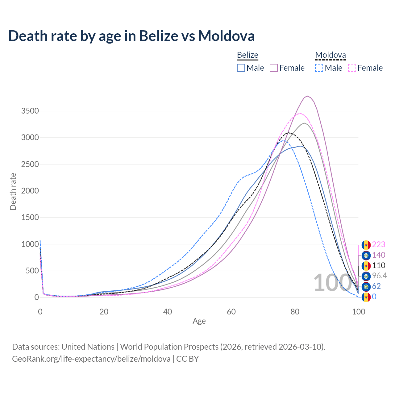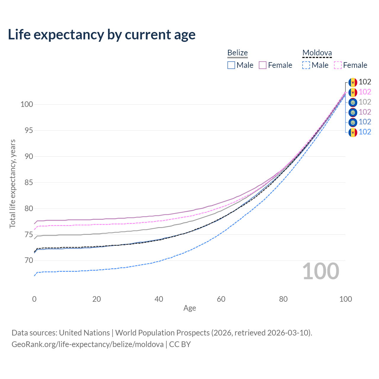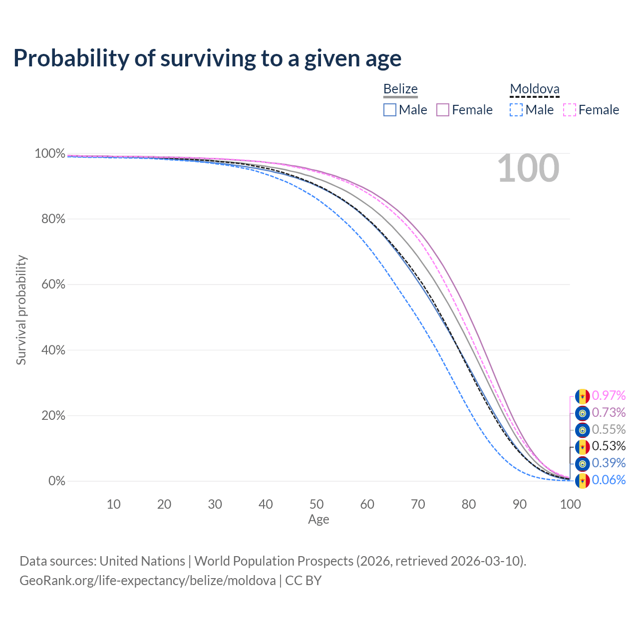 This life expectancy calculator shows the odds of living to 100, 95, 90, and below based on current age for both males and females in Belize and Moldova, along with mean and median age of death. The calculations are based on the 2026 life tables (actuarial tables) from the UN World Population Prospects.