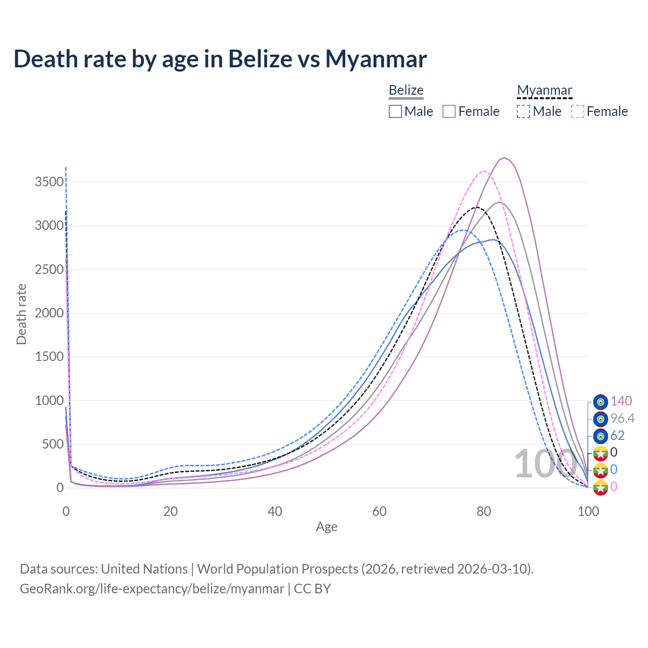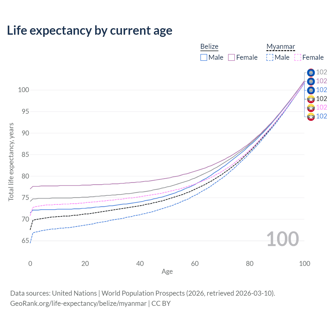 This life expectancy calculator shows the odds of living to 100, 95, 90, and below based on current age for both males and females in Belize and Myanmar, along with mean and median age of death. The calculations are based on the 2026 life tables (actuarial tables) from the UN World Population Prospects.
