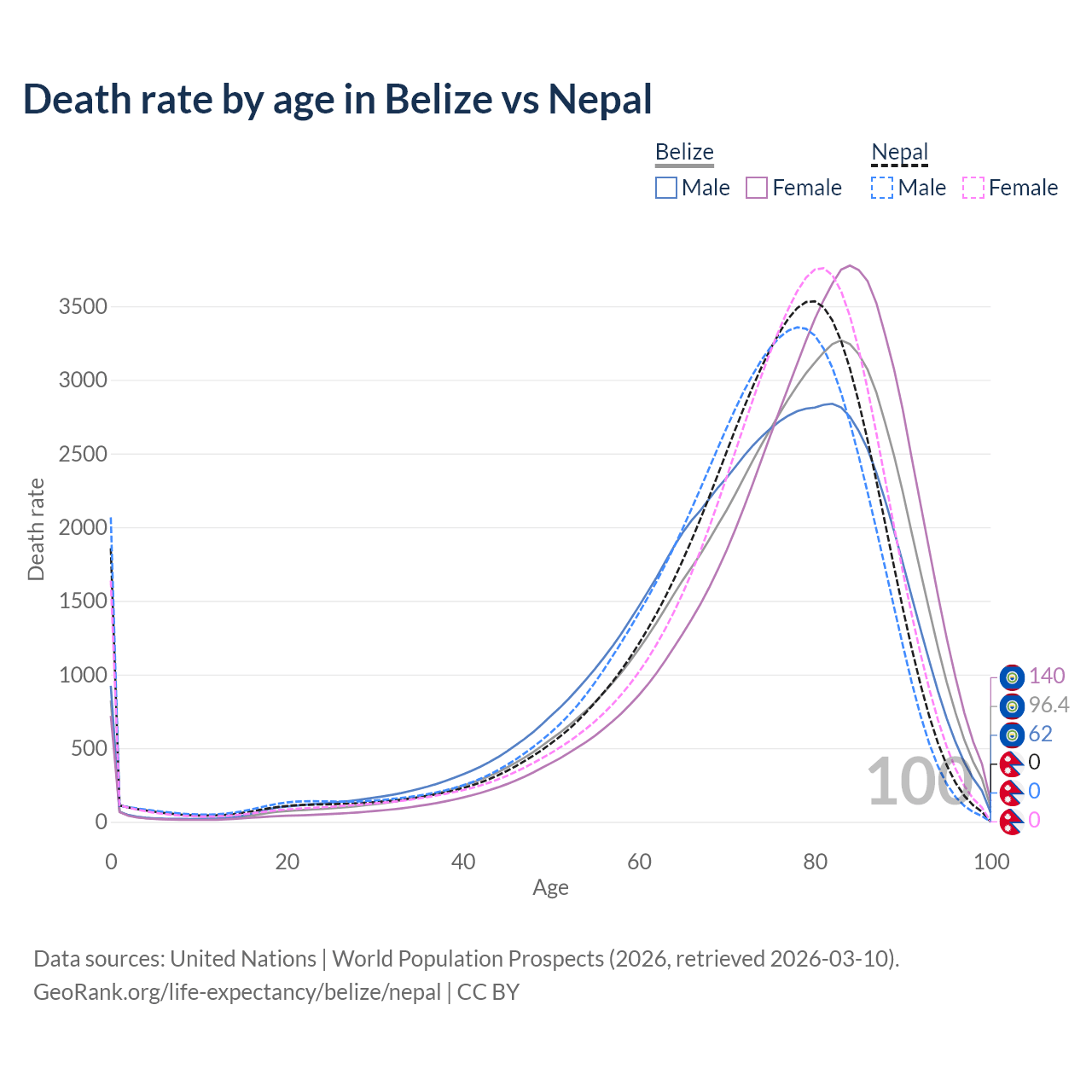 In Belize, the most common age of death is 83, compared to 80 in Nepal. The median age of death is 77.5 in Belize and 75.4 in Nepal, meaning only half of each cohort is expected to live past that age.