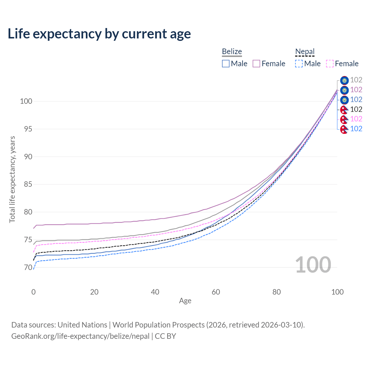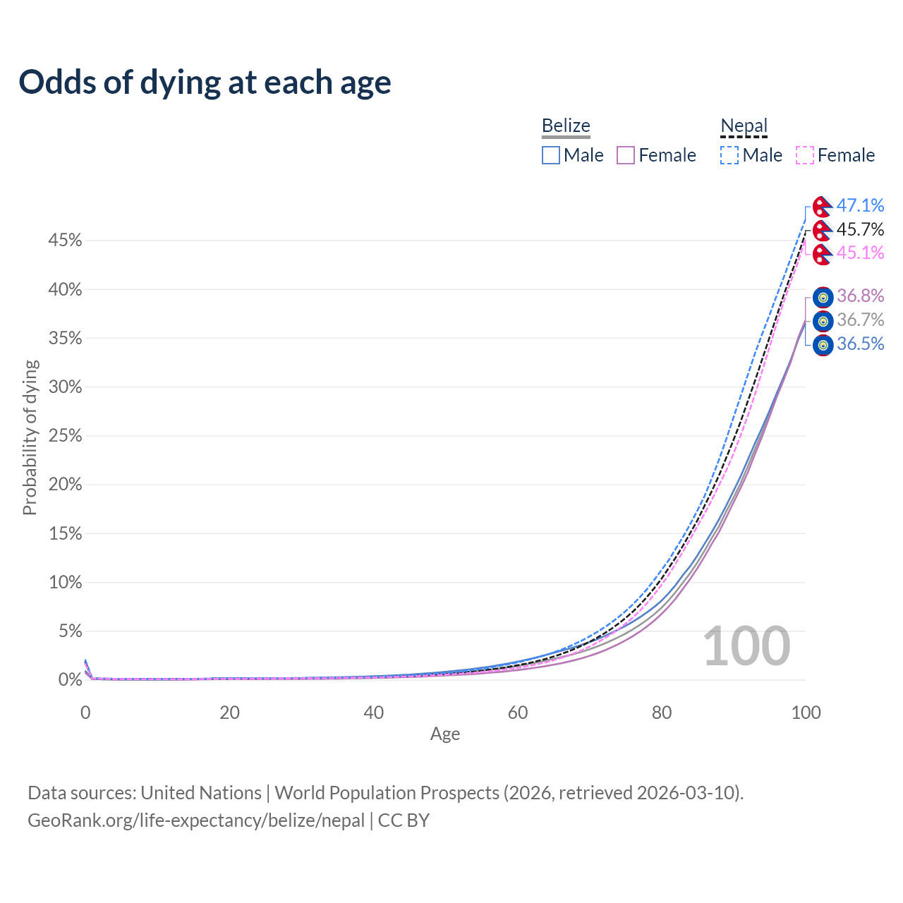 This life expectancy calculator shows the odds of living to 100, 95, 90, and below based on current age for both males and females in Belize and Nepal, along with mean and median age of death. The calculations are based on the 2026 life tables (actuarial tables) from the UN World Population Prospects.