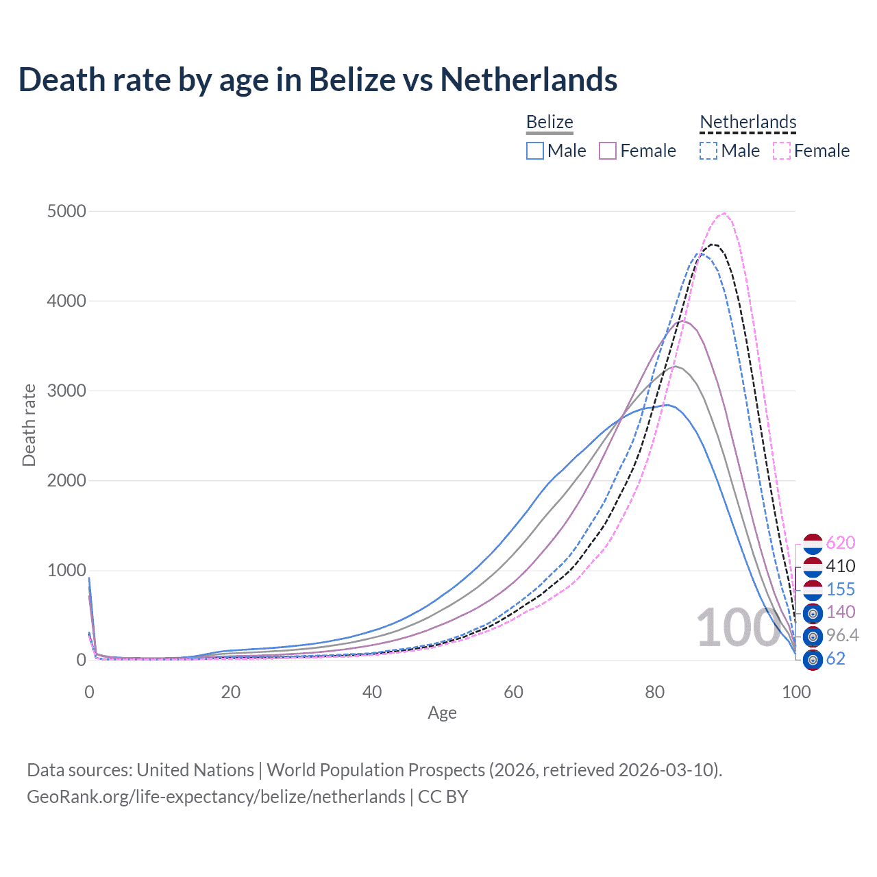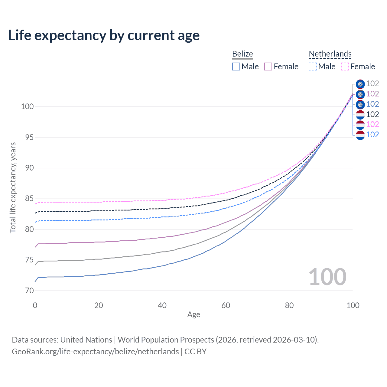 This life expectancy calculator shows the odds of living to 100, 95, 90, and below based on current age for both males and females in Belize and the Netherlands, along with mean and median age of death. The calculations are based on the 2026 life tables (actuarial tables) from the UN World Population Prospects.