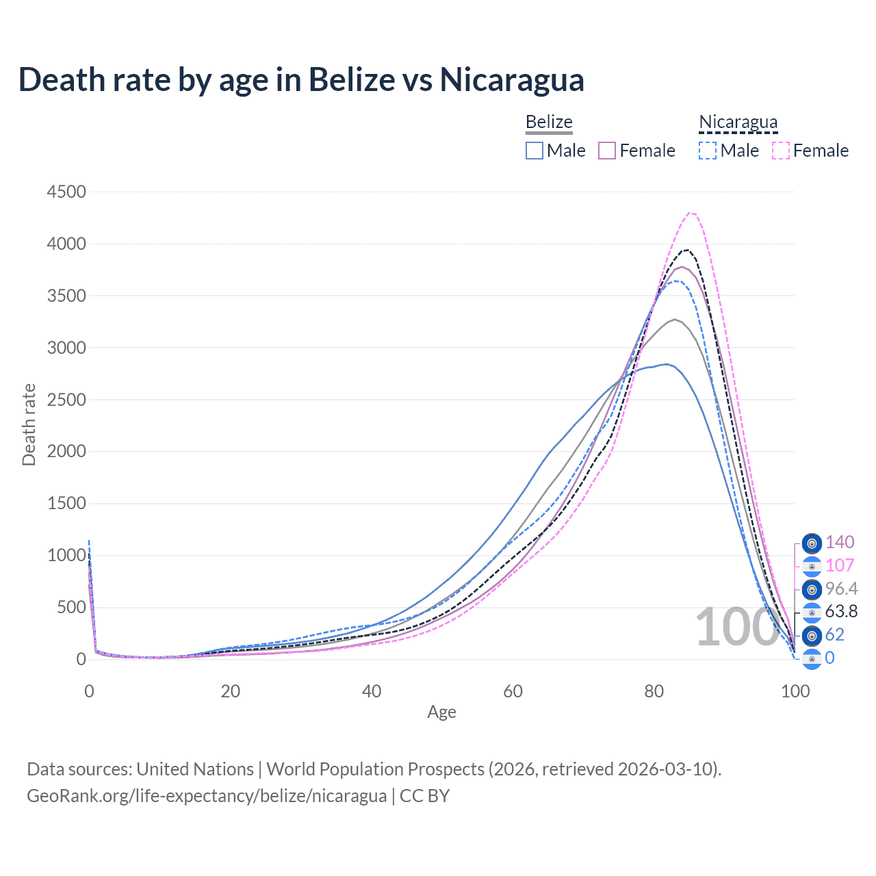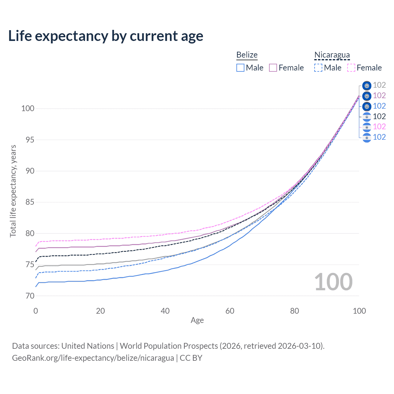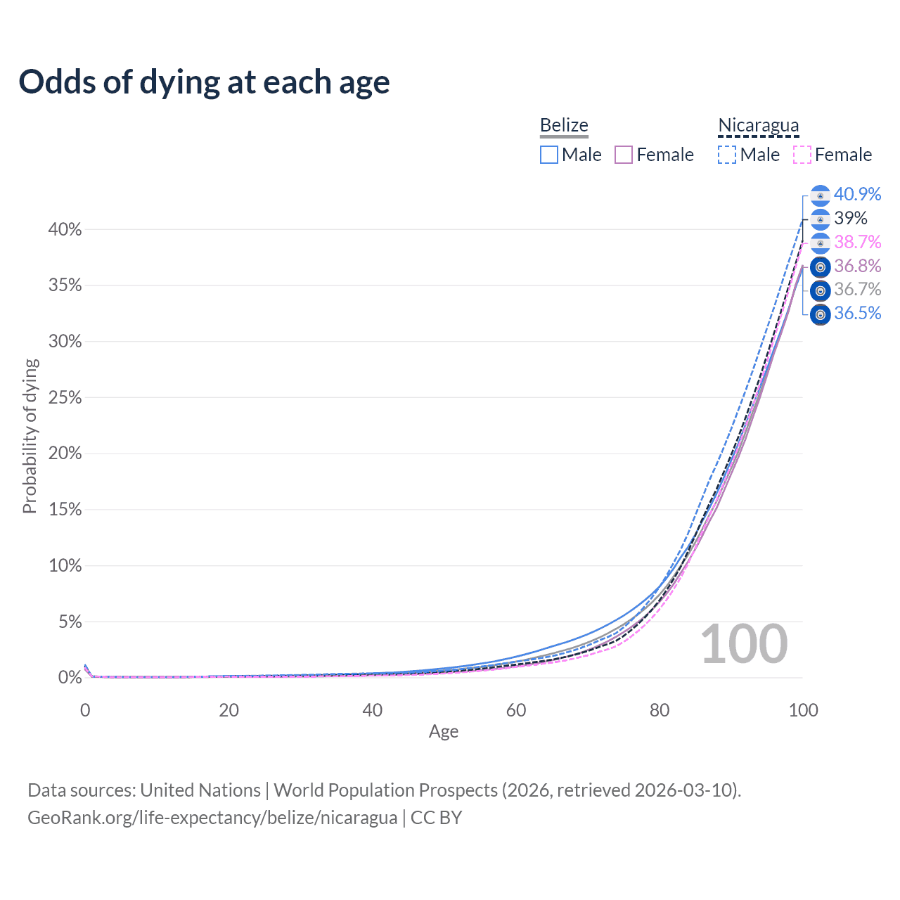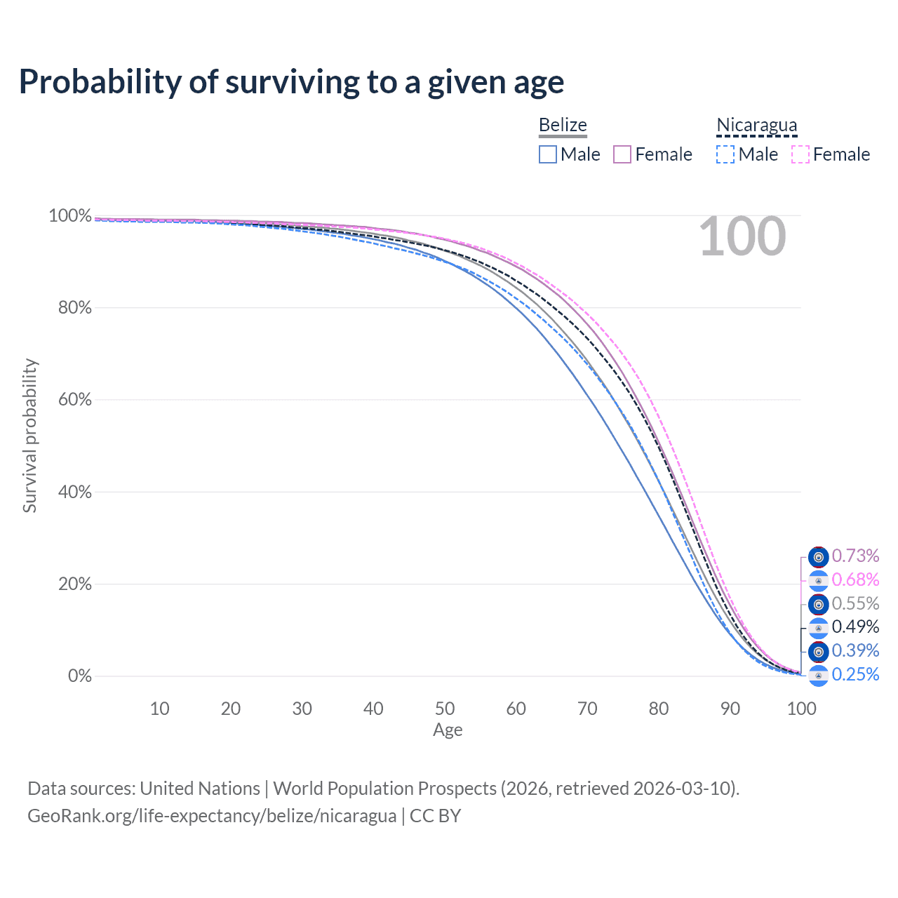This life expectancy calculator shows the odds of living to 100, 95, 90, and below based on current age for both males and females in Belize and Nicaragua, along with mean and median age of death. The calculations are based on the 2026 life tables (actuarial tables) from the UN World Population Prospects.