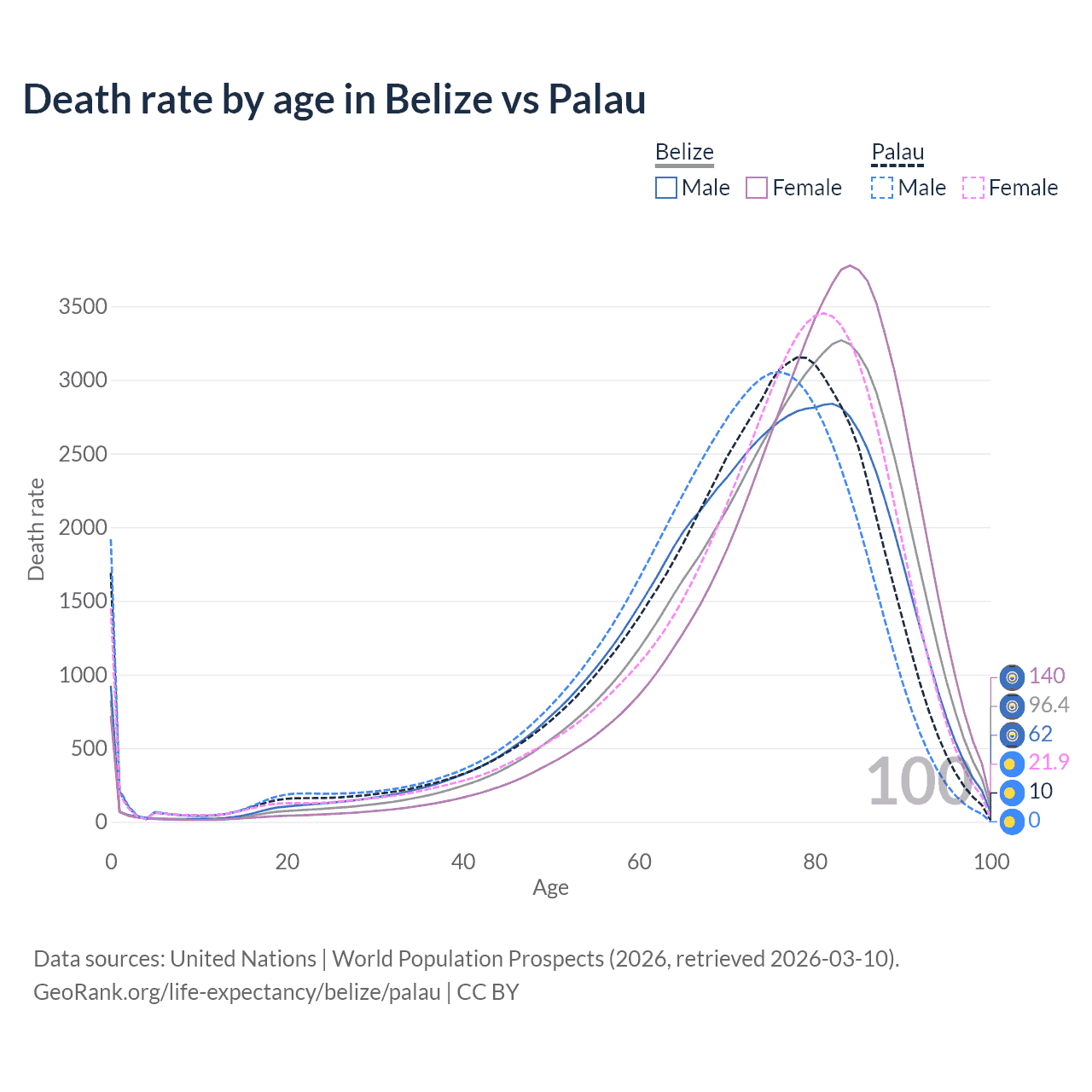In Belize, the most common age of death is 83, compared to 78 in Palau. The median age of death is 77.5 in Belize and 73.8 in Palau, meaning only half of each cohort is expected to live past that age.