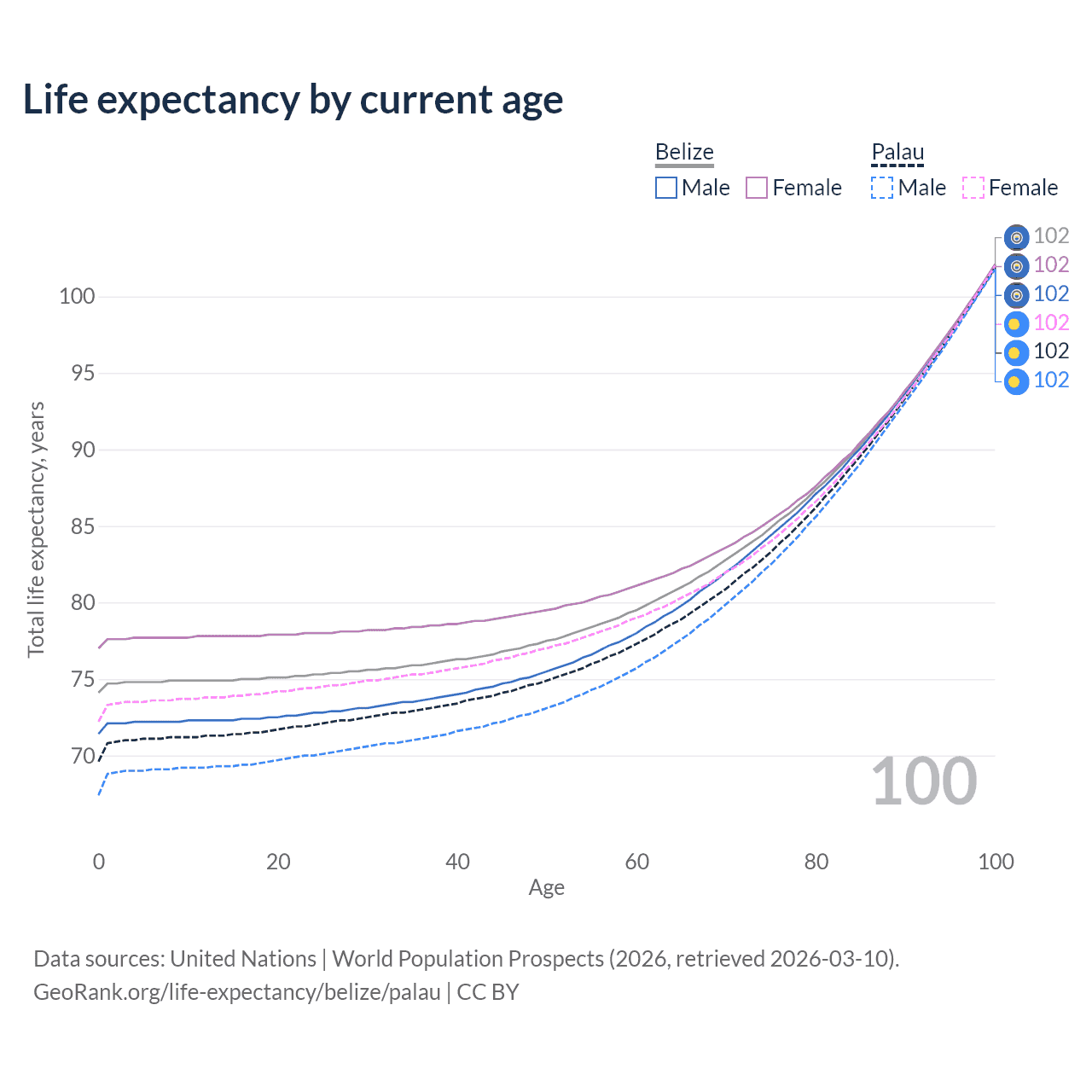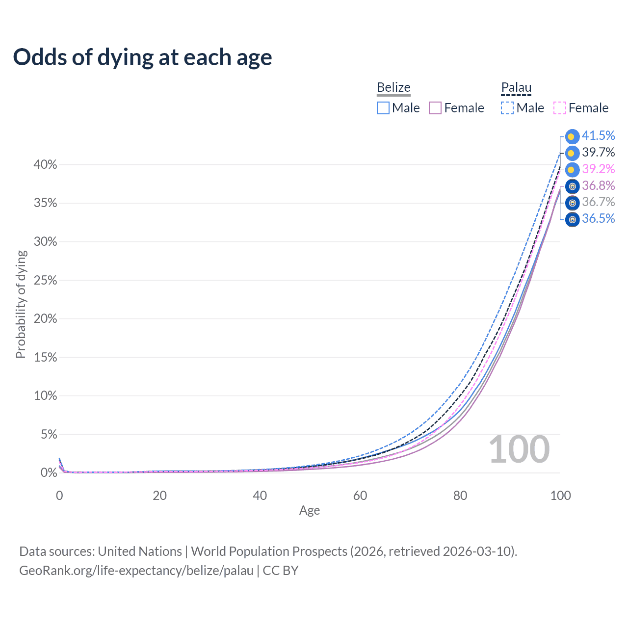 This life expectancy calculator shows the odds of living to 100, 95, 90, and below based on current age for both males and females in Belize and Palau, along with mean and median age of death. The calculations are based on the 2026 life tables (actuarial tables) from the UN World Population Prospects.