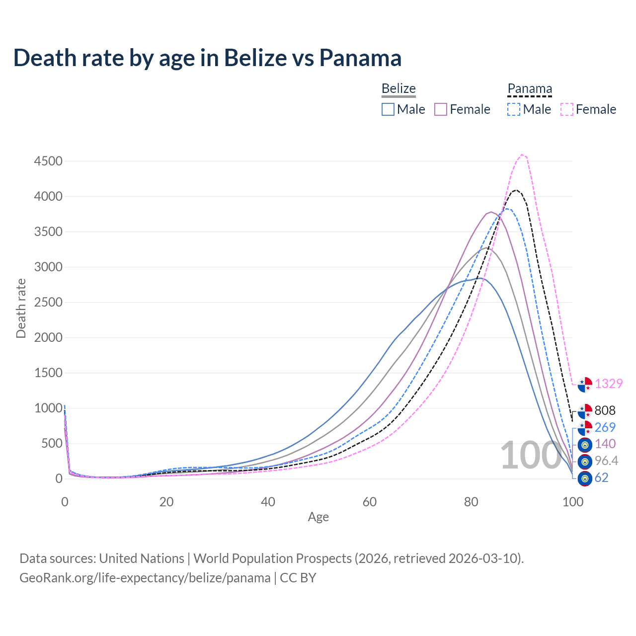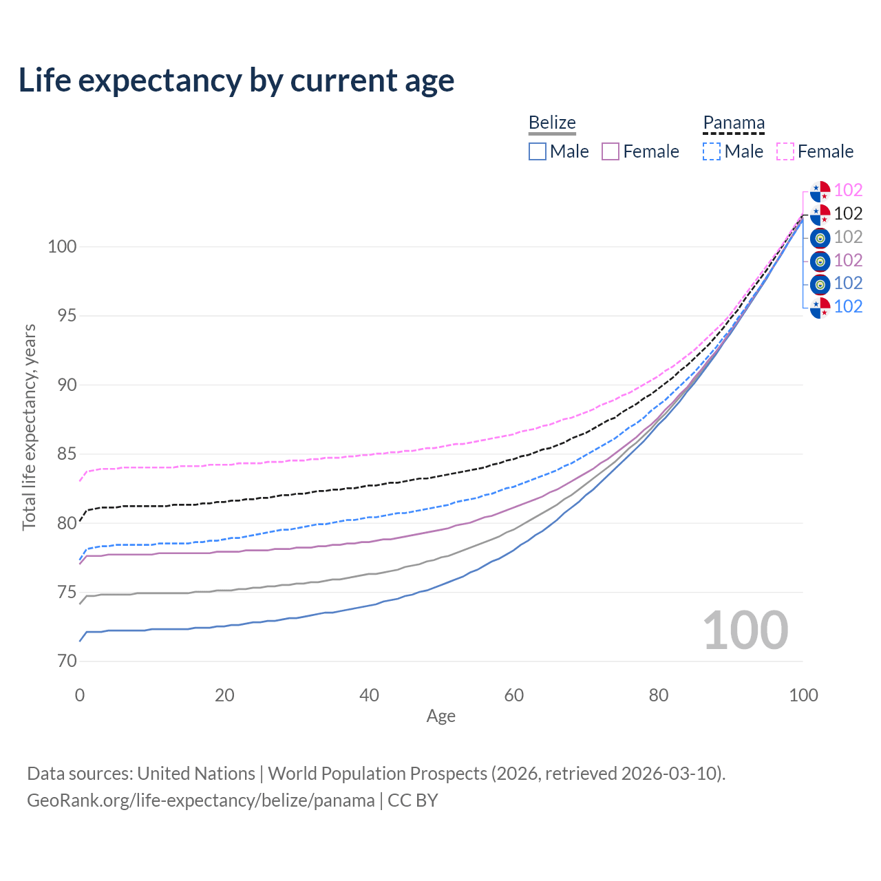 This life expectancy calculator shows the odds of living to 100, 95, 90, and below based on current age for both males and females in Belize and Panama, along with mean and median age of death. The calculations are based on the 2026 life tables (actuarial tables) from the UN World Population Prospects.