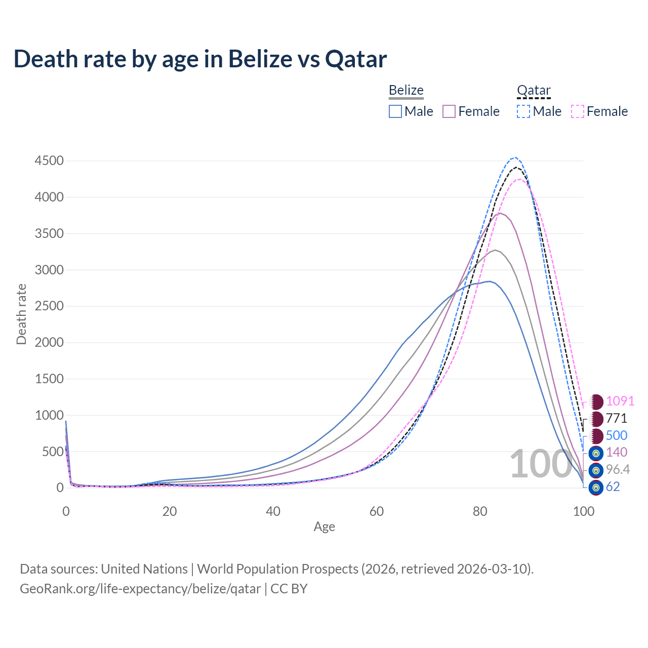 In Belize, the most common age of death is 83, compared to 87 in Qatar. The median age of death is 77.5 in Belize and 85.1 in Qatar, meaning only half of each cohort is expected to live past that age.