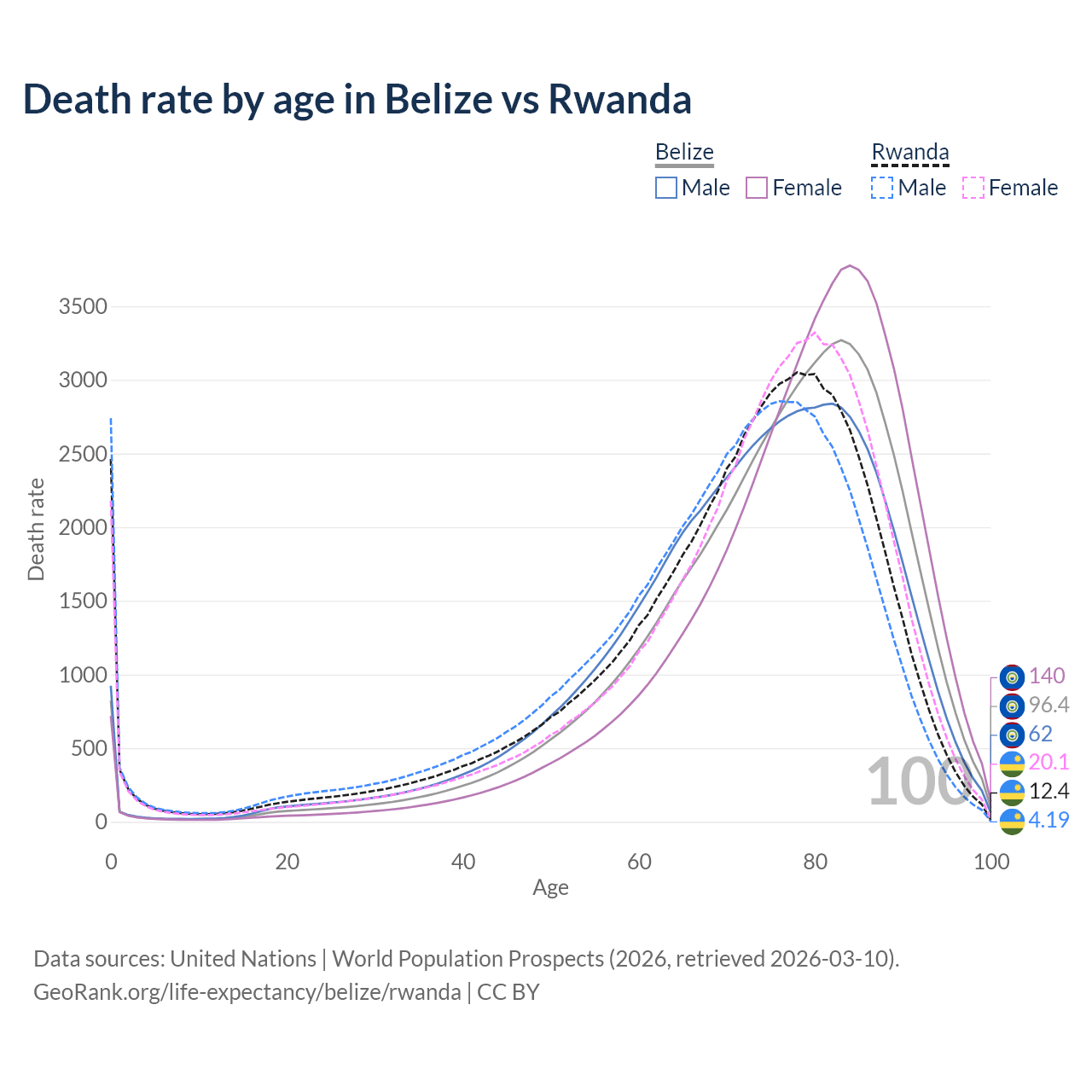 The average life expectancy at birth is 74.1 years in Belize vs 68.5 in Rwanda. Belize is ranked 102/197 by life expectancy, and Rwanda is 148/197. In Belize, the life expectancy is 71.4 years for males and 77 years for females. In Rwanda, it's 66.1 years for males and 70.6 years for females.