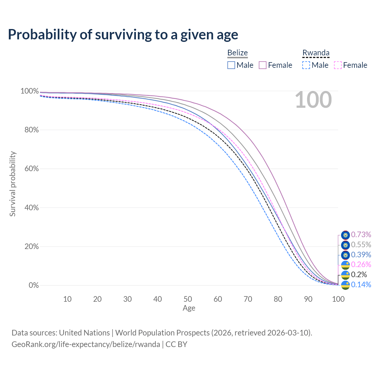 This life expectancy calculator shows the odds of living to 100, 95, 90, and below based on current age for both males and females in Belize and Rwanda, along with mean and median age of death. The calculations are based on the 2026 life tables (actuarial tables) from the UN World Population Prospects.