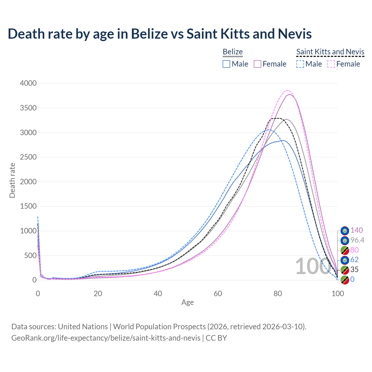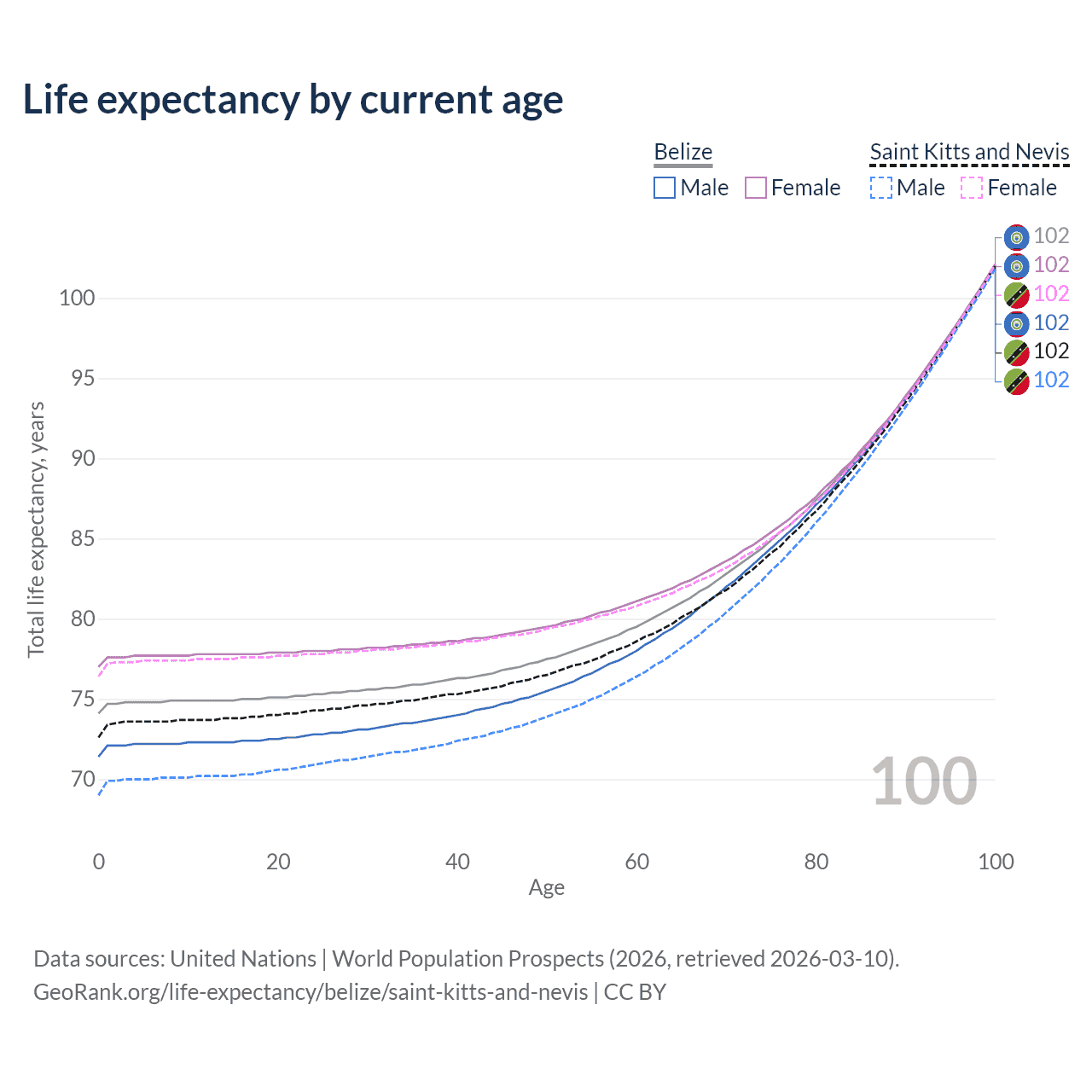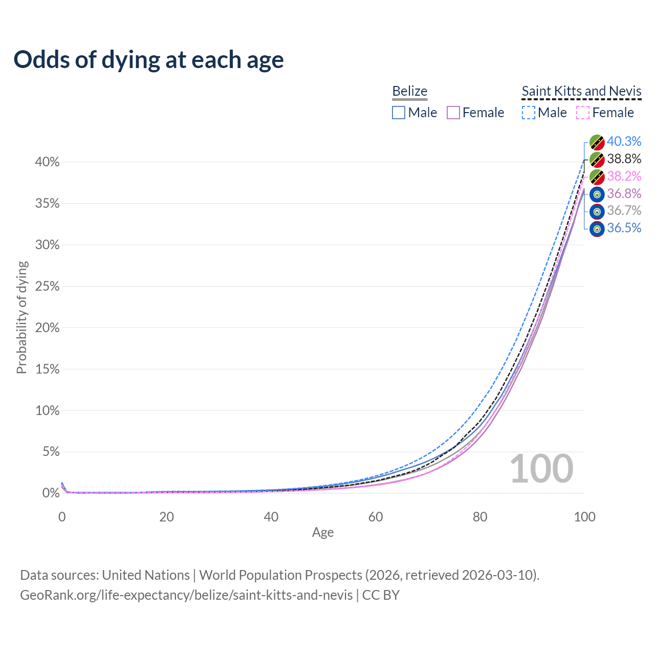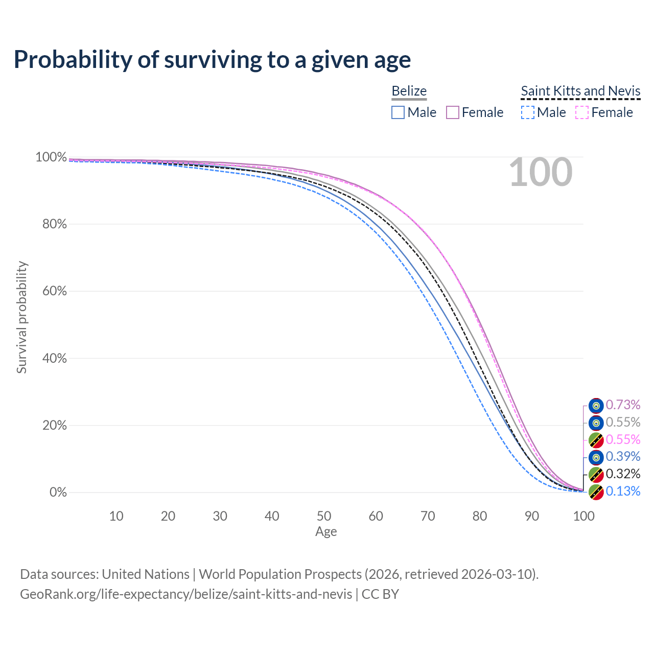 This life expectancy calculator shows the odds of living to 100, 95, 90, and below based on current age for both males and females in Belize and Saint Kitts and Nevis, along with mean and median age of death. The calculations are based on the 2026 life tables (actuarial tables) from the UN World Population Prospects.
