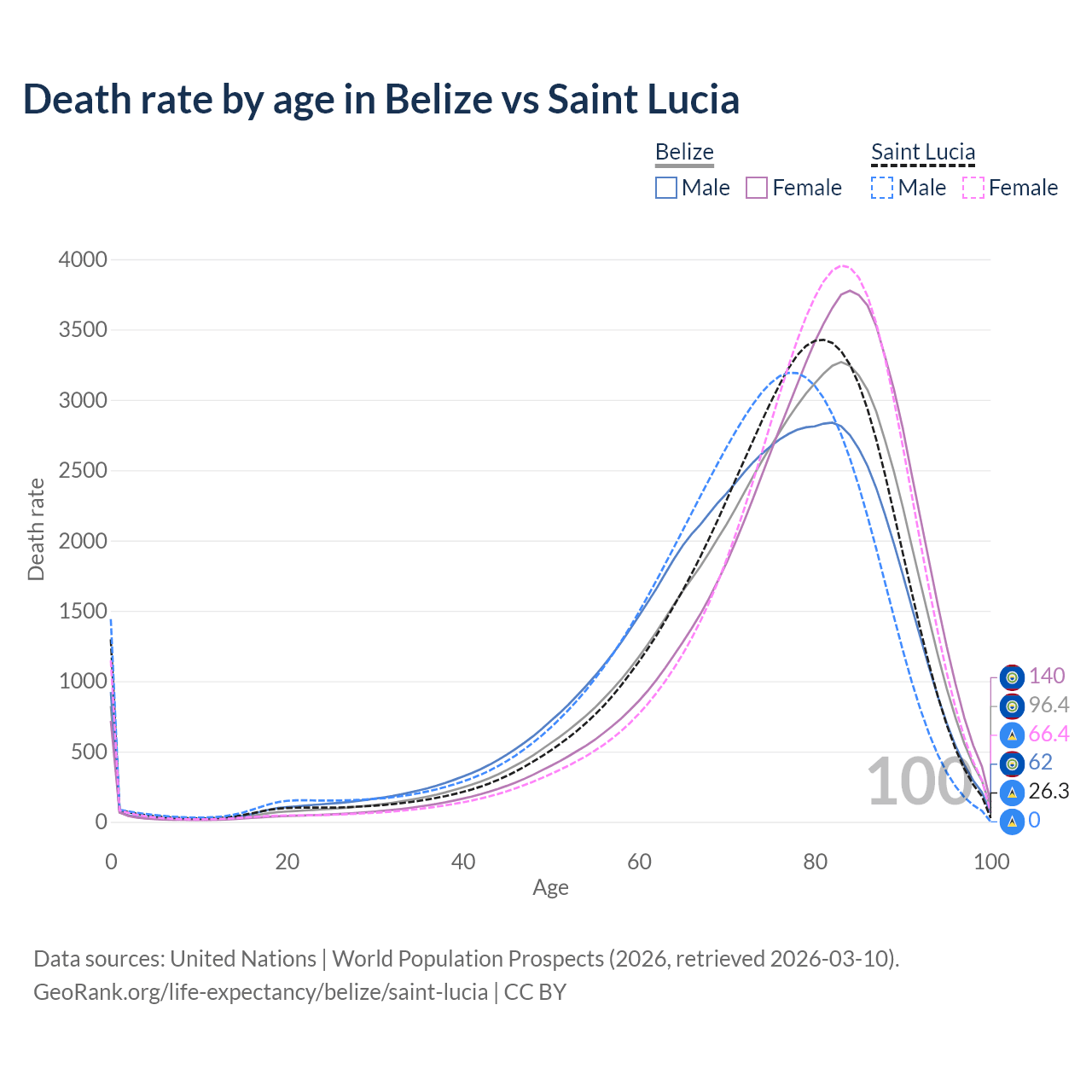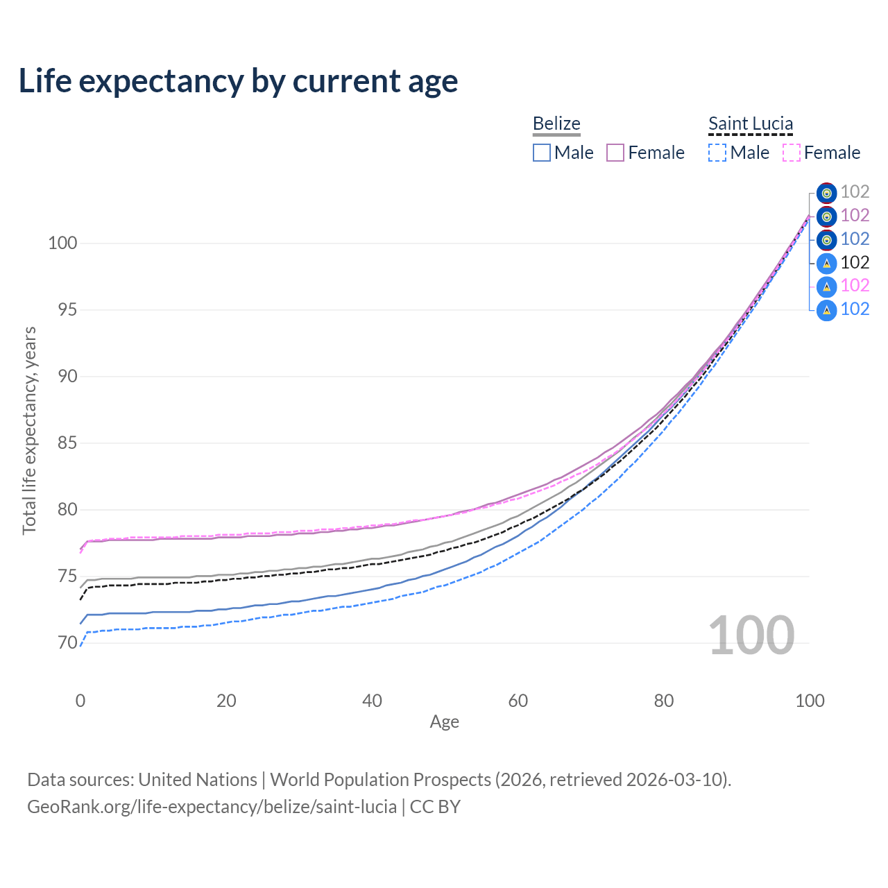 This life expectancy calculator shows the odds of living to 100, 95, 90, and below based on current age for both males and females in Belize and Saint Lucia, along with mean and median age of death. The calculations are based on the 2026 life tables (actuarial tables) from the UN World Population Prospects.
