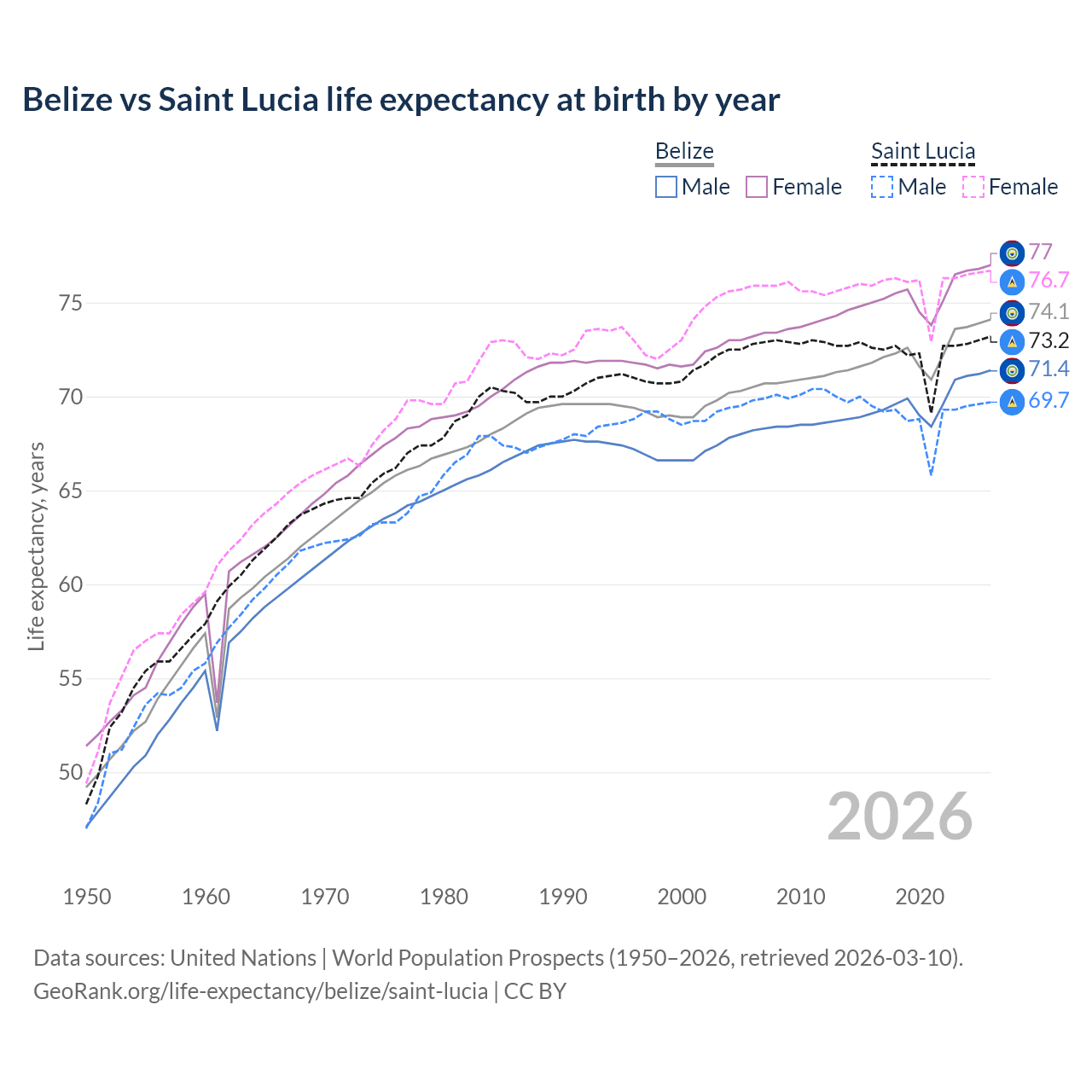 GeoRank.org/life-expectancy/belize/saint-lucia | CC BY