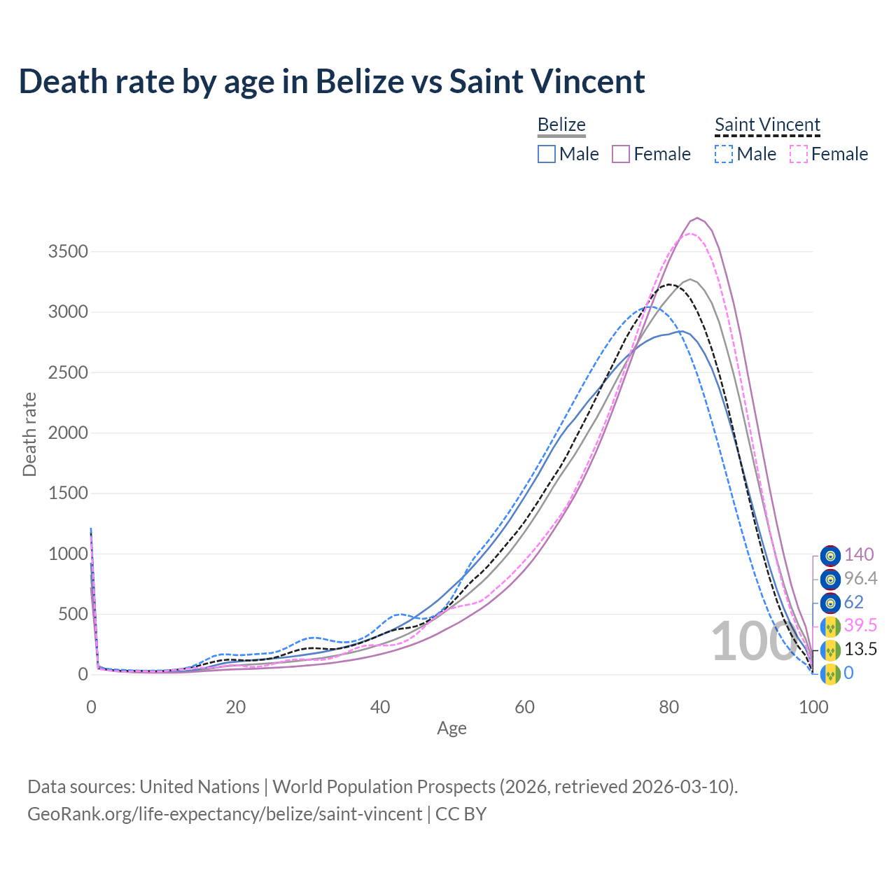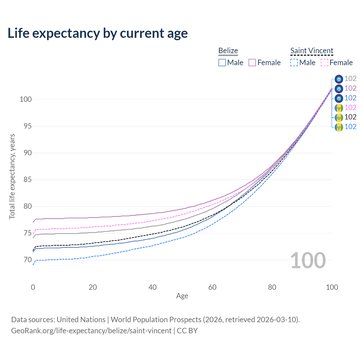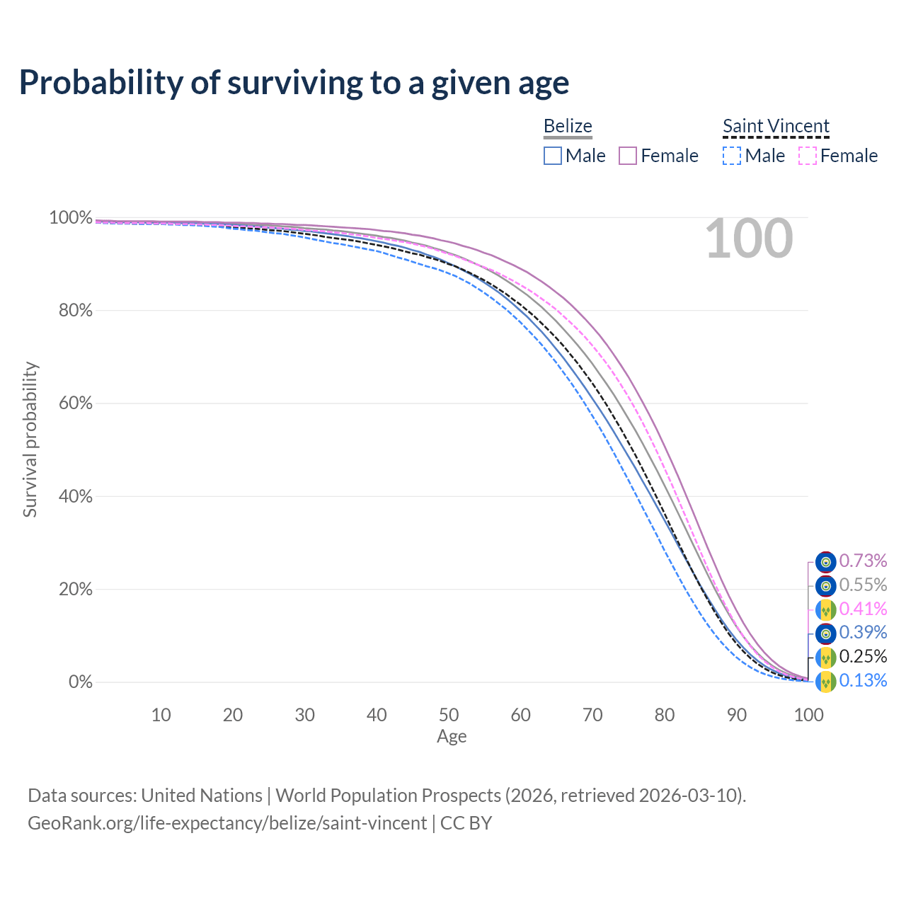 This life expectancy calculator shows the odds of living to 100, 95, 90, and below based on current age for both males and females in Belize and Saint Vincent, along with mean and median age of death. The calculations are based on the 2026 life tables (actuarial tables) from the UN World Population Prospects.