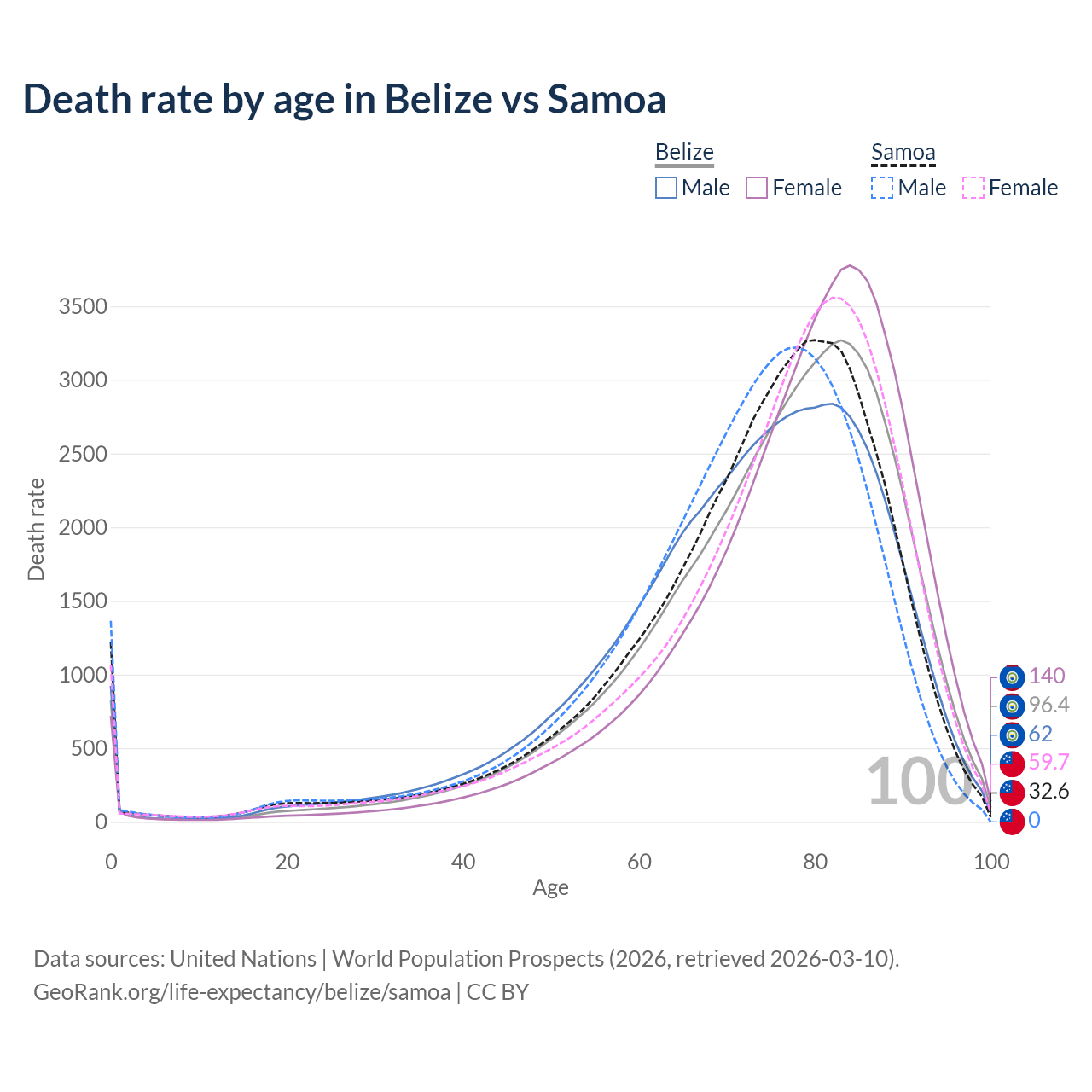 In Belize, the most common age of death is 83, compared to 80 in Samoa. The median age of death is 77.5 in Belize and 75.9 in Samoa, meaning only half of each cohort is expected to live past that age.