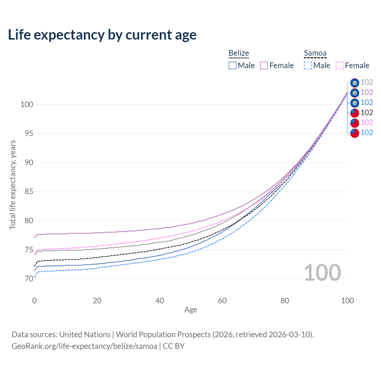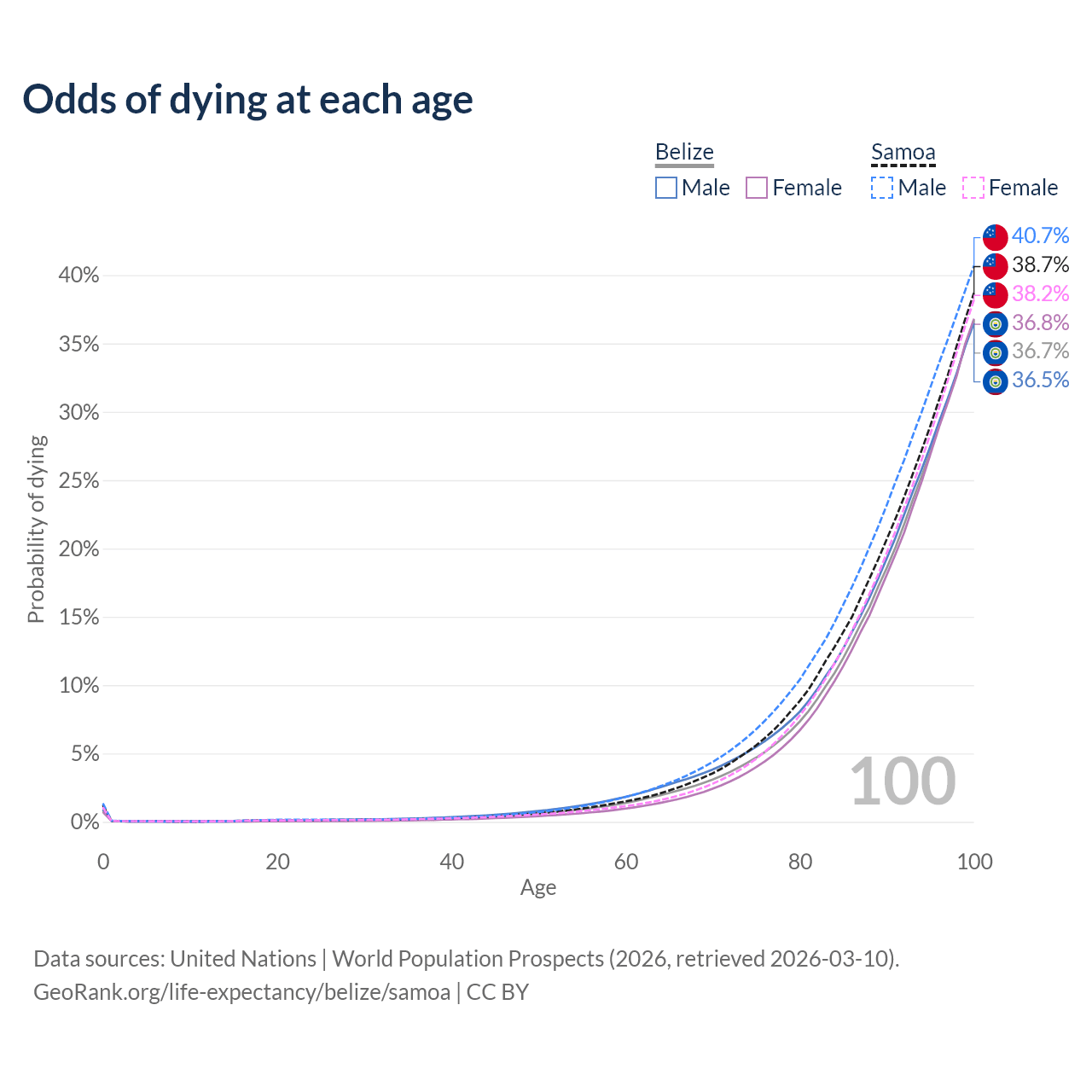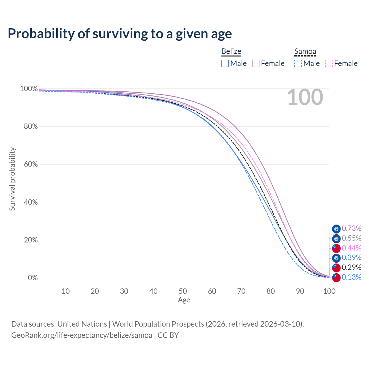 This life expectancy calculator shows the odds of living to 100, 95, 90, and below based on current age for both males and females in Belize and Samoa, along with mean and median age of death. The calculations are based on the 2026 life tables (actuarial tables) from the UN World Population Prospects.
