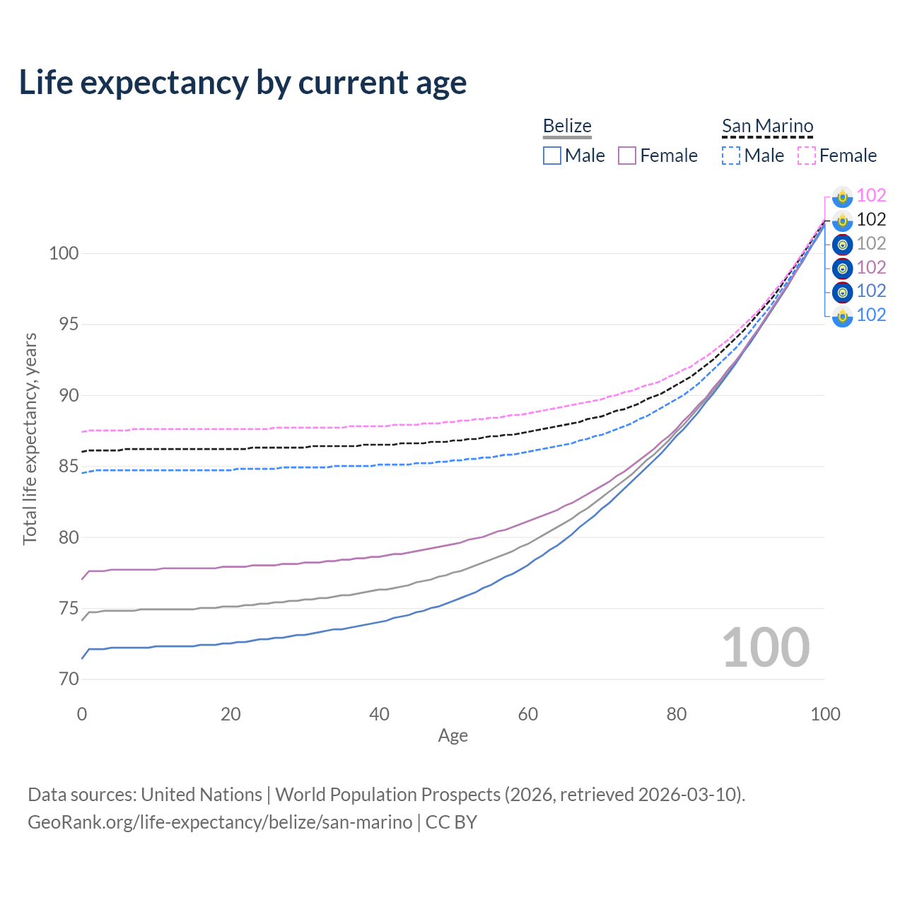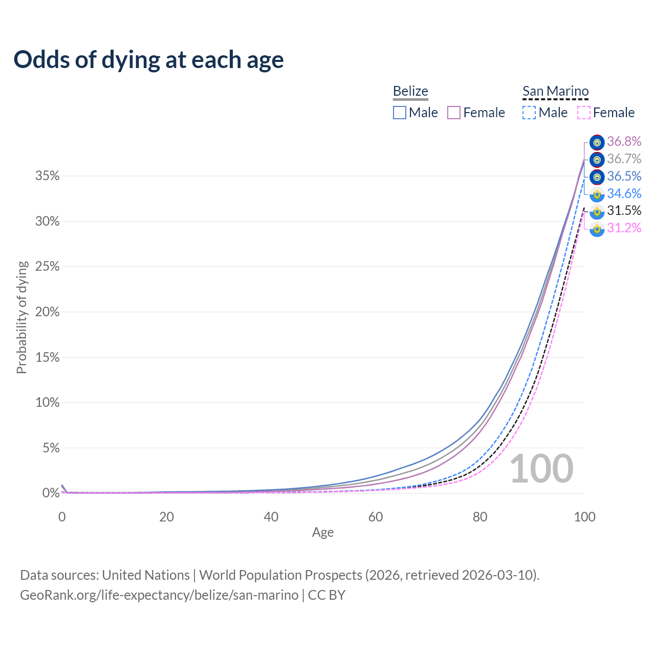 This life expectancy calculator shows the odds of living to 100, 95, 90, and below based on current age for both males and females in Belize and San Marino, along with mean and median age of death. The calculations are based on the 2026 life tables (actuarial tables) from the UN World Population Prospects.