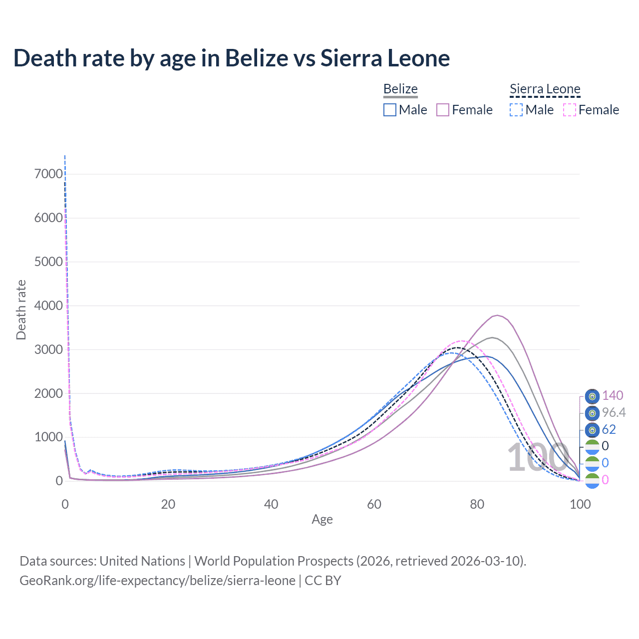 In Belize, the most common age of death is 83, compared to 0 in Sierra Leone. The median age of death is 77.5 in Belize and 70.8 in Sierra Leone, meaning only half of each cohort is expected to live past that age.