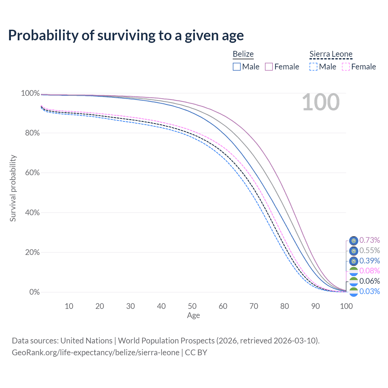 This life expectancy calculator shows the odds of living to 100, 95, 90, and below based on current age for both males and females in Belize and Sierra Leone, along with mean and median age of death. The calculations are based on the 2026 life tables (actuarial tables) from the UN World Population Prospects.