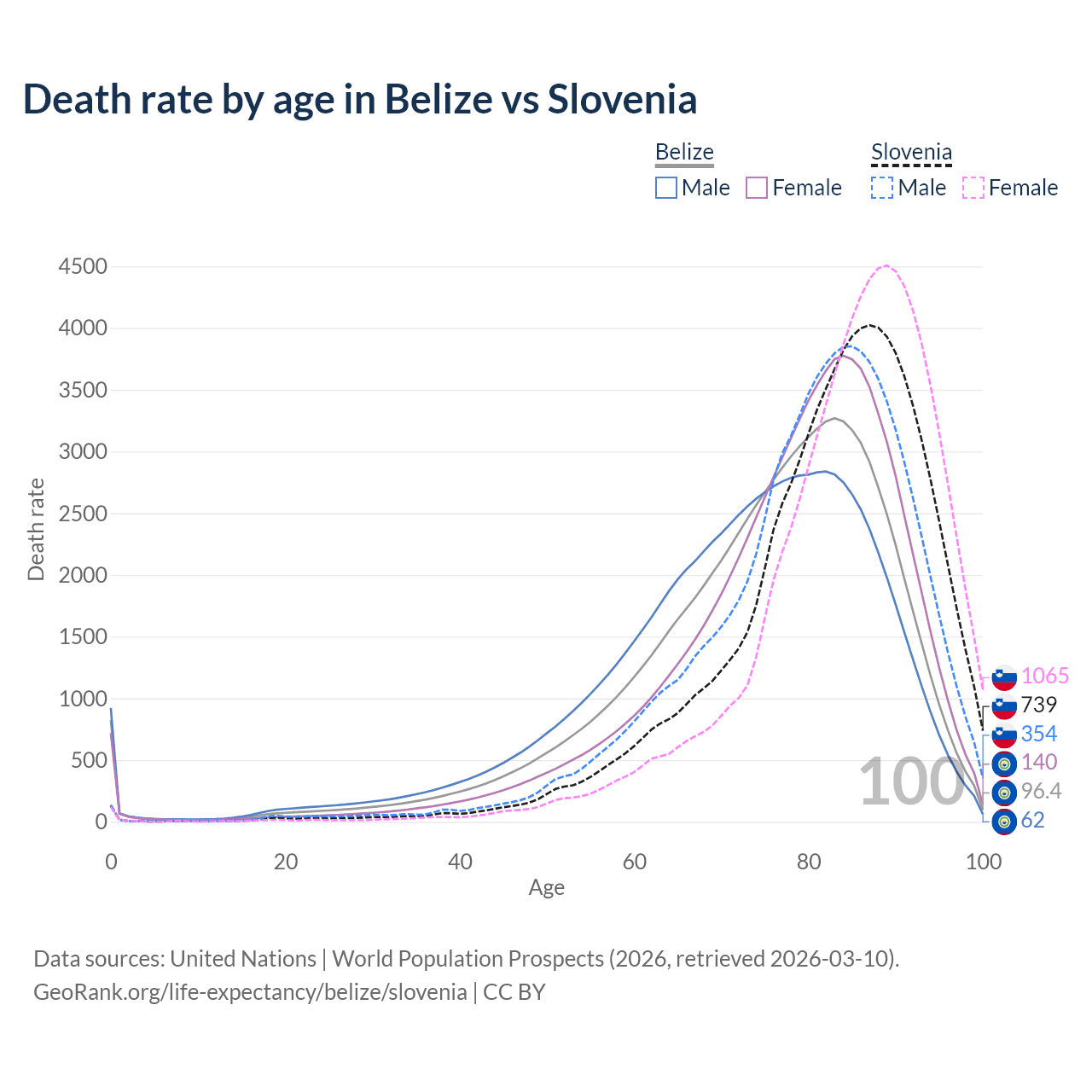 In Belize, the most common age of death is 83, compared to 87 in Slovenia. The median age of death is 77.5 in Belize and 84.4 in Slovenia, meaning only half of each cohort is expected to live past that age.