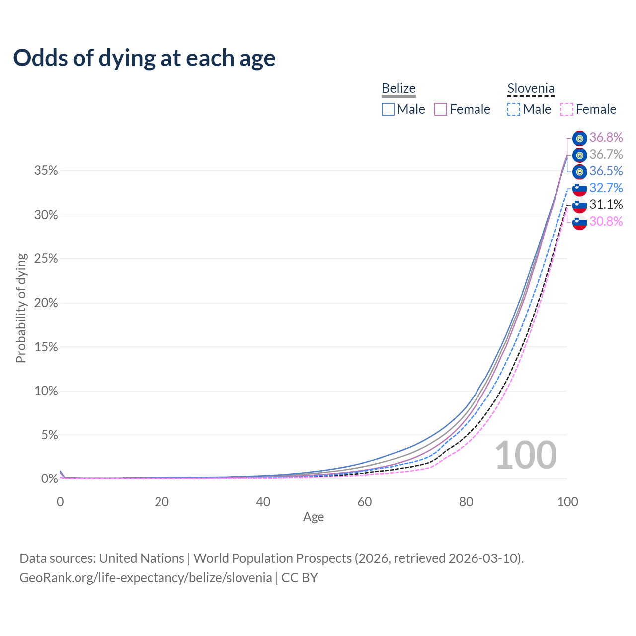 This life expectancy calculator shows the odds of living to 100, 95, 90, and below based on current age for both males and females in Belize and Slovenia, along with mean and median age of death. The calculations are based on the 2026 life tables (actuarial tables) from the UN World Population Prospects.