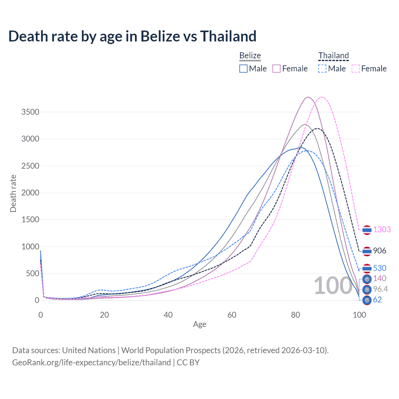 In Belize, the most common age of death is 83, compared to 87 in Thailand. The median age of death is 77.5 in Belize and 81.8 in Thailand, meaning only half of each cohort is expected to live past that age.