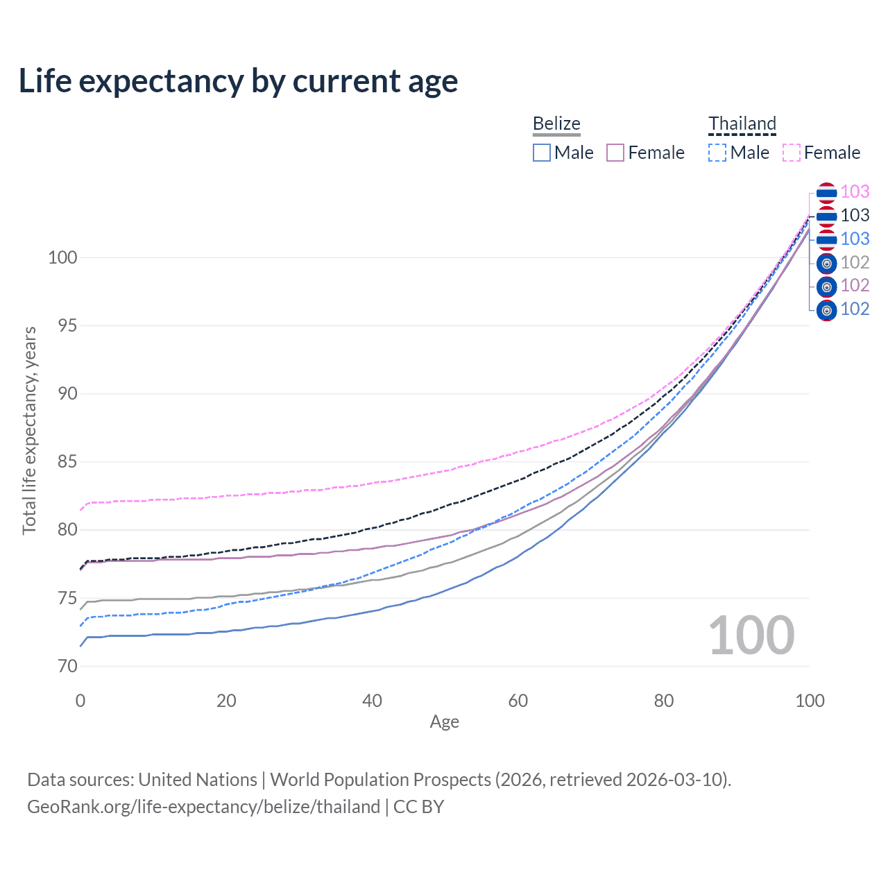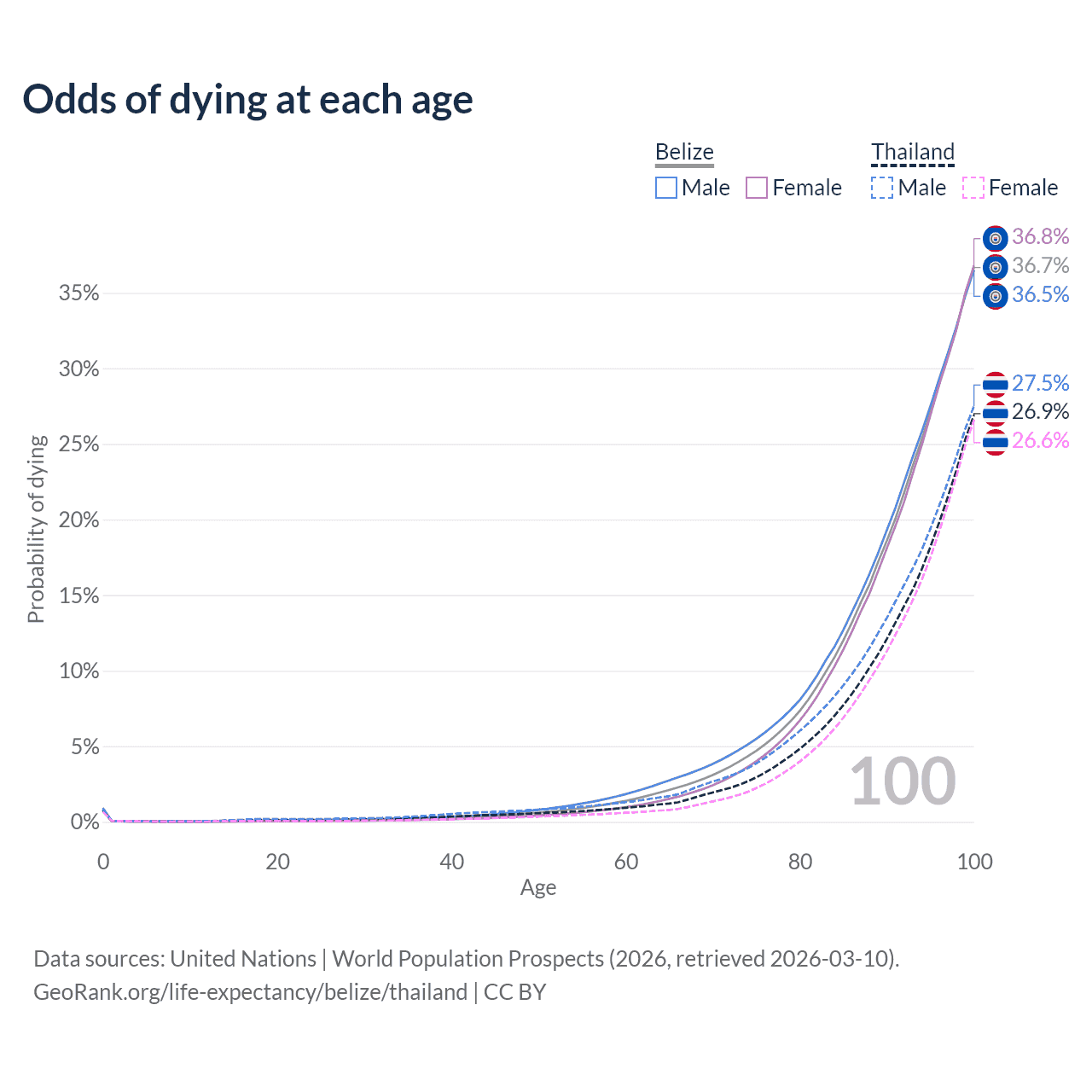 This life expectancy calculator shows the odds of living to 100, 95, 90, and below based on current age for both males and females in Belize and Thailand, along with mean and median age of death. The calculations are based on the 2026 life tables (actuarial tables) from the UN World Population Prospects.