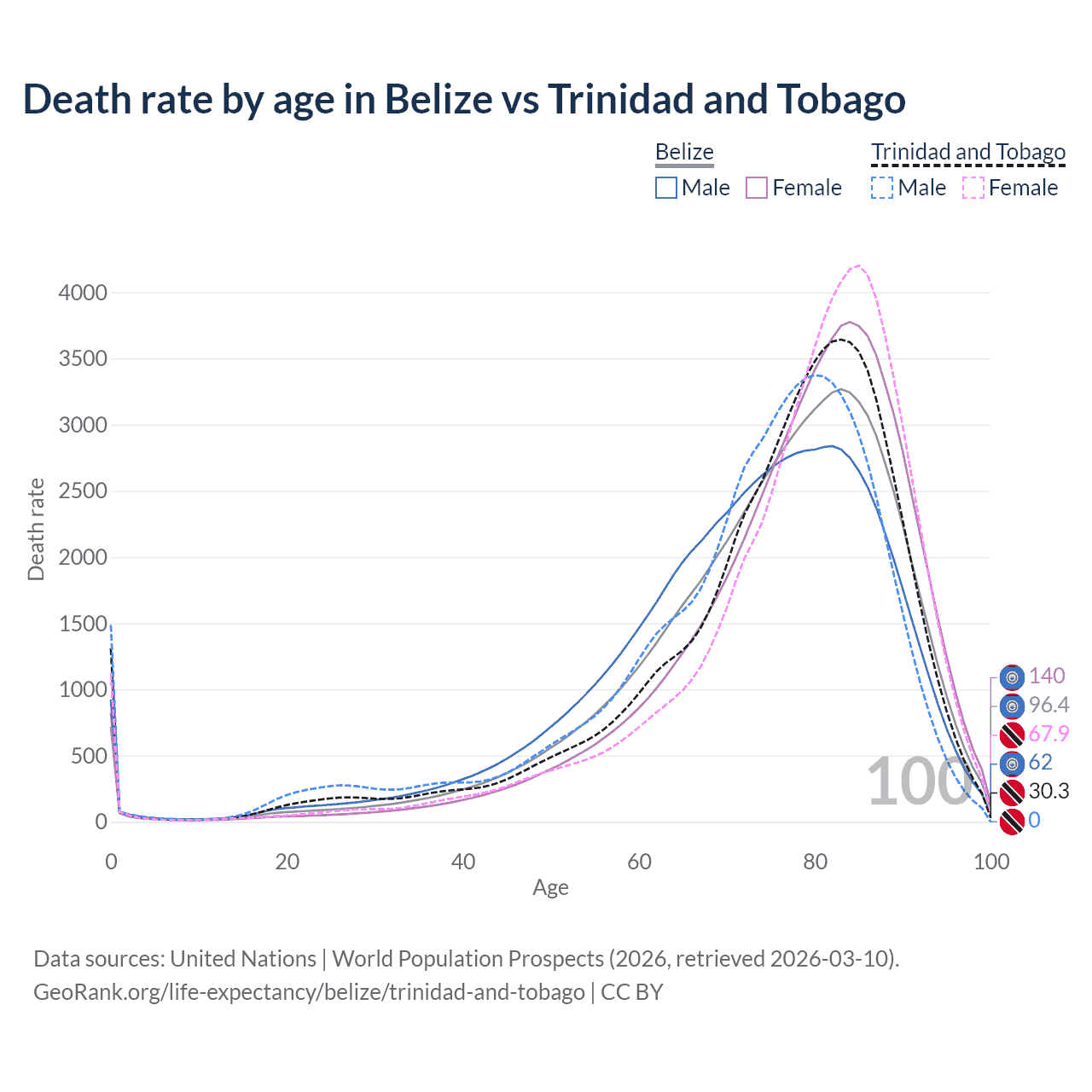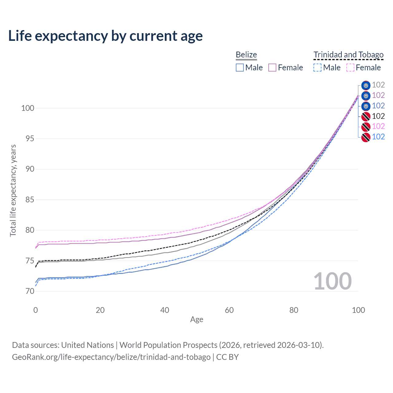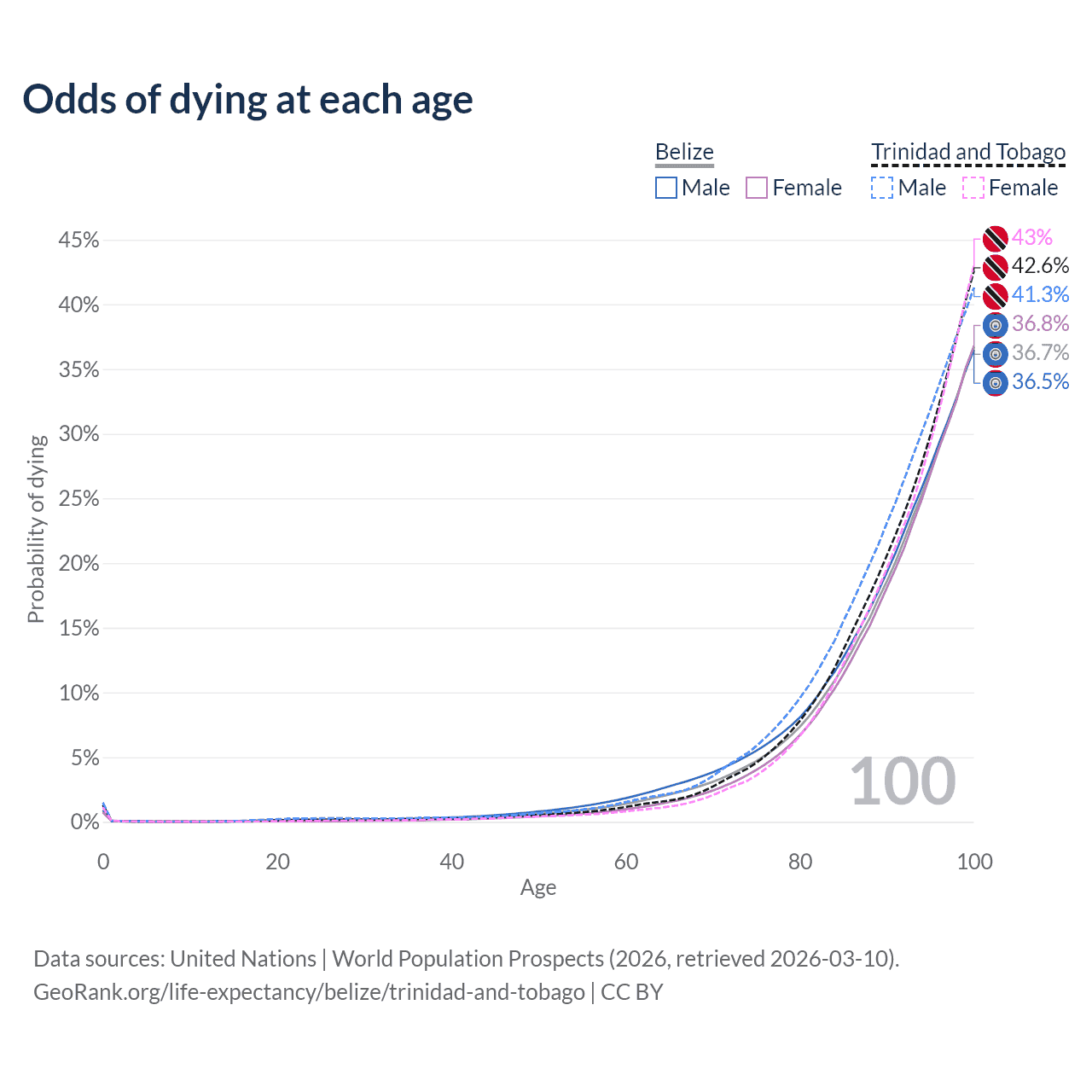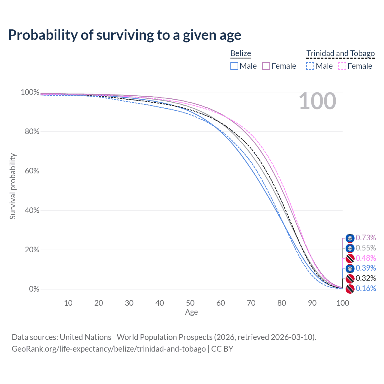 This life expectancy calculator shows the odds of living to 100, 95, 90, and below based on current age for both males and females in Belize and Trinidad and Tobago, along with mean and median age of death. The calculations are based on the 2026 life tables (actuarial tables) from the UN World Population Prospects.