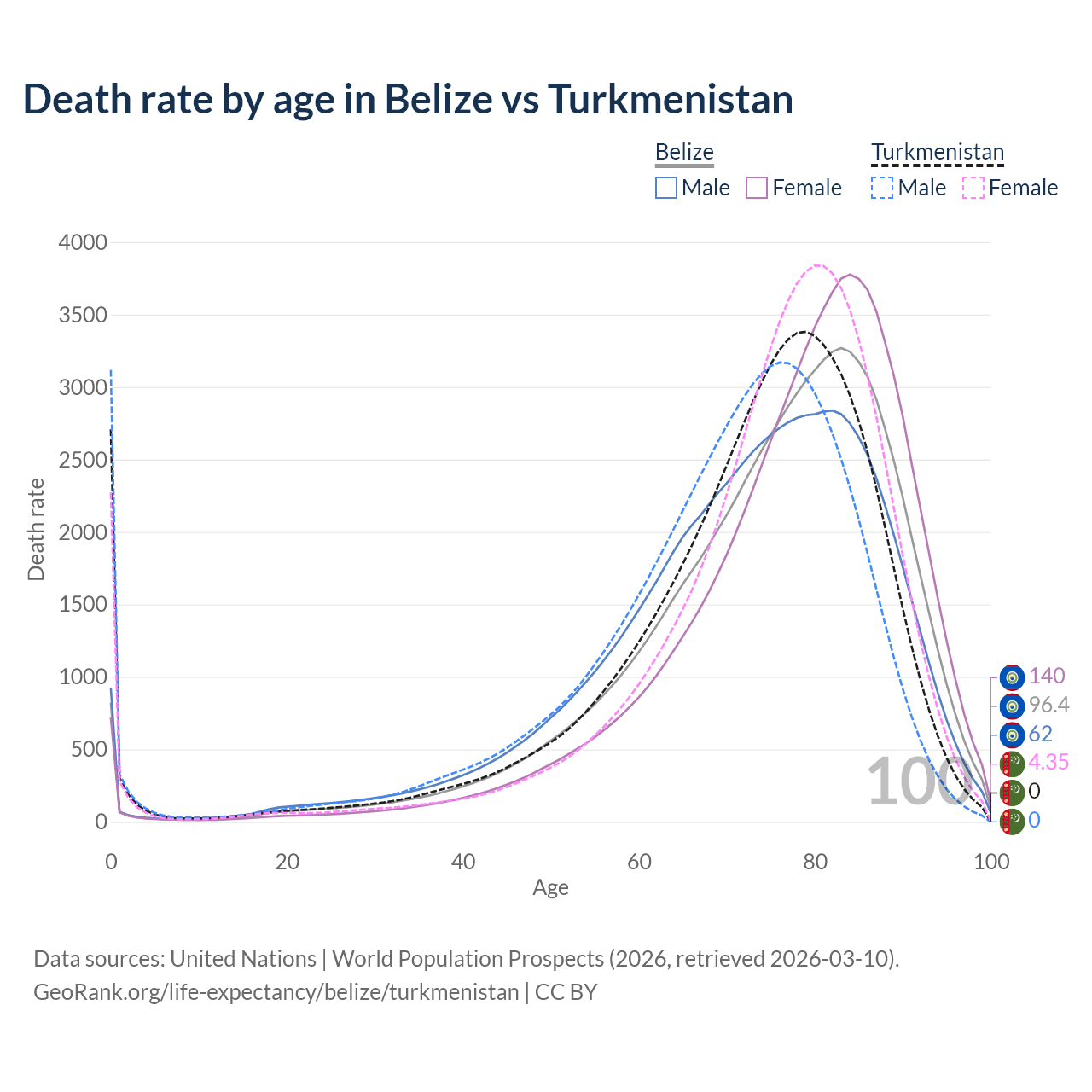In Belize, the most common age of death is 83, compared to 79 in Turkmenistan. The median age of death is 77.5 in Belize and 75.1 in Turkmenistan, meaning only half of each cohort is expected to live past that age.