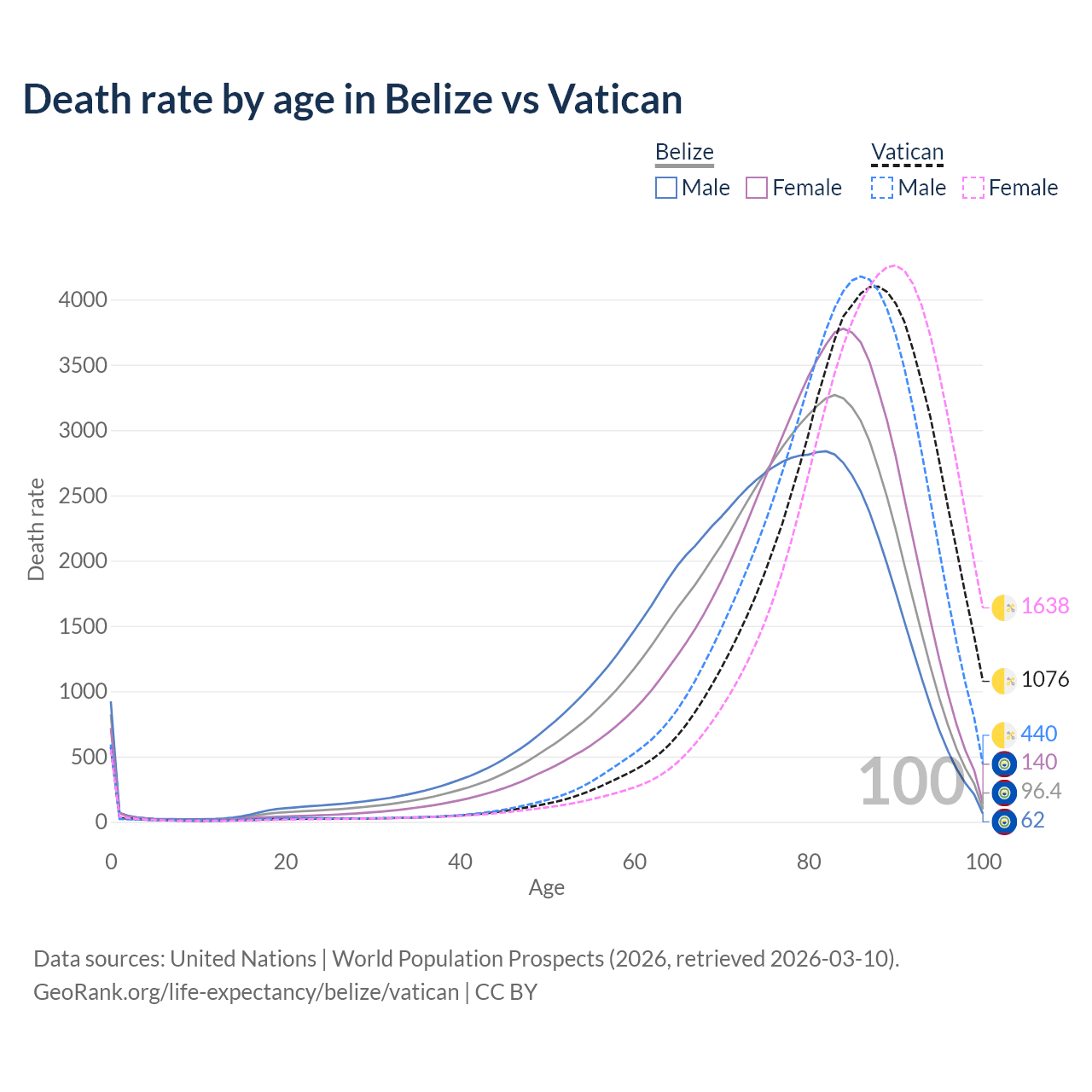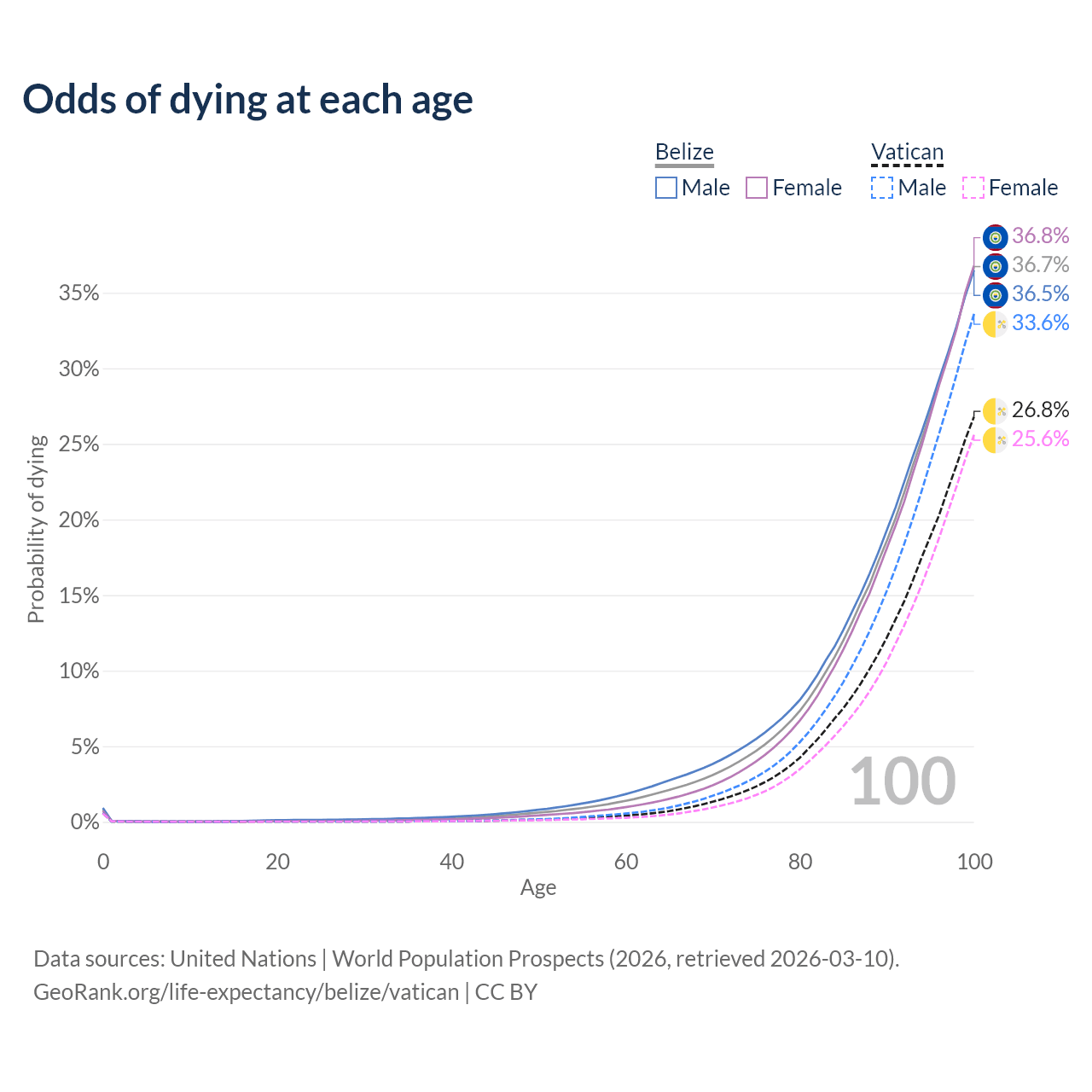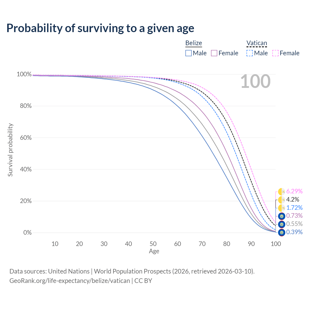 This life expectancy calculator shows the odds of living to 100, 95, 90, and below based on current age for both males and females in Belize and the Vatican, along with mean and median age of death. The calculations are based on the 2026 life tables (actuarial tables) from the UN World Population Prospects.