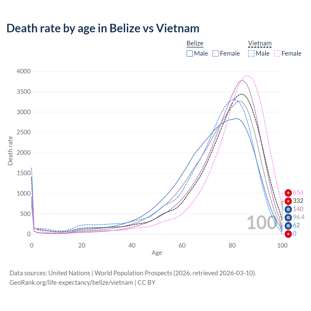 In Belize, the most common age of death is 83, compared to 84 in Vietnam. The median age of death is 77.5 in Belize and 79.9 in Vietnam, meaning only half of each cohort is expected to live past that age.