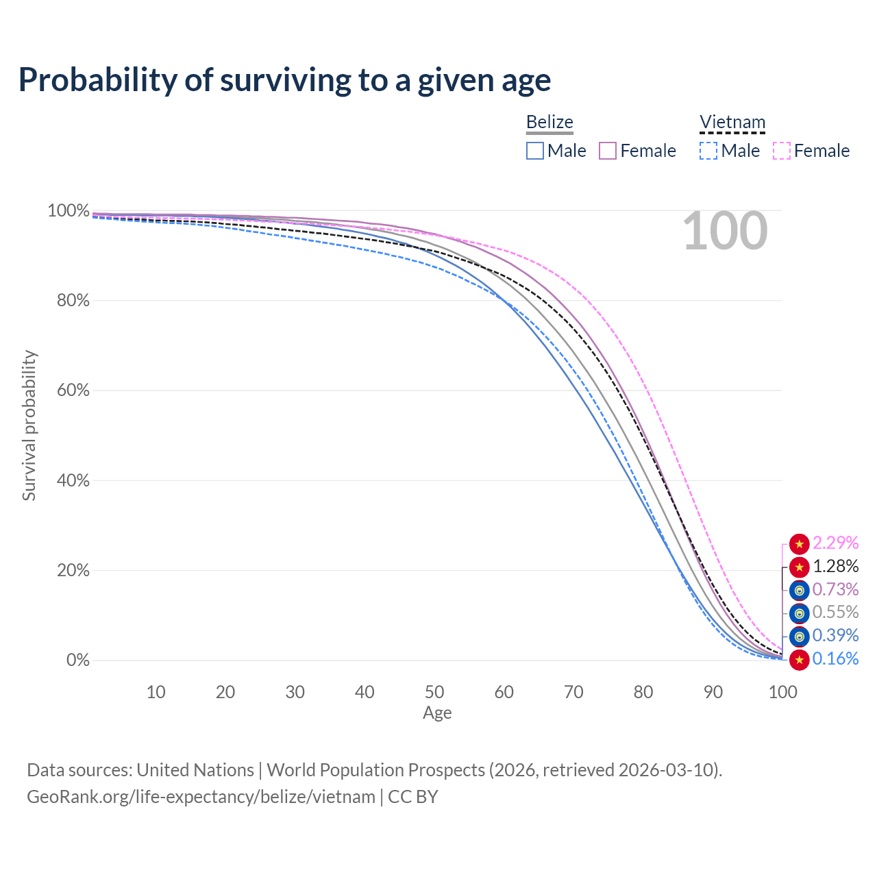 This life expectancy calculator shows the odds of living to 100, 95, 90, and below based on current age for both males and females in Belize and Vietnam, along with mean and median age of death. The calculations are based on the 2026 life tables (actuarial tables) from the UN World Population Prospects.