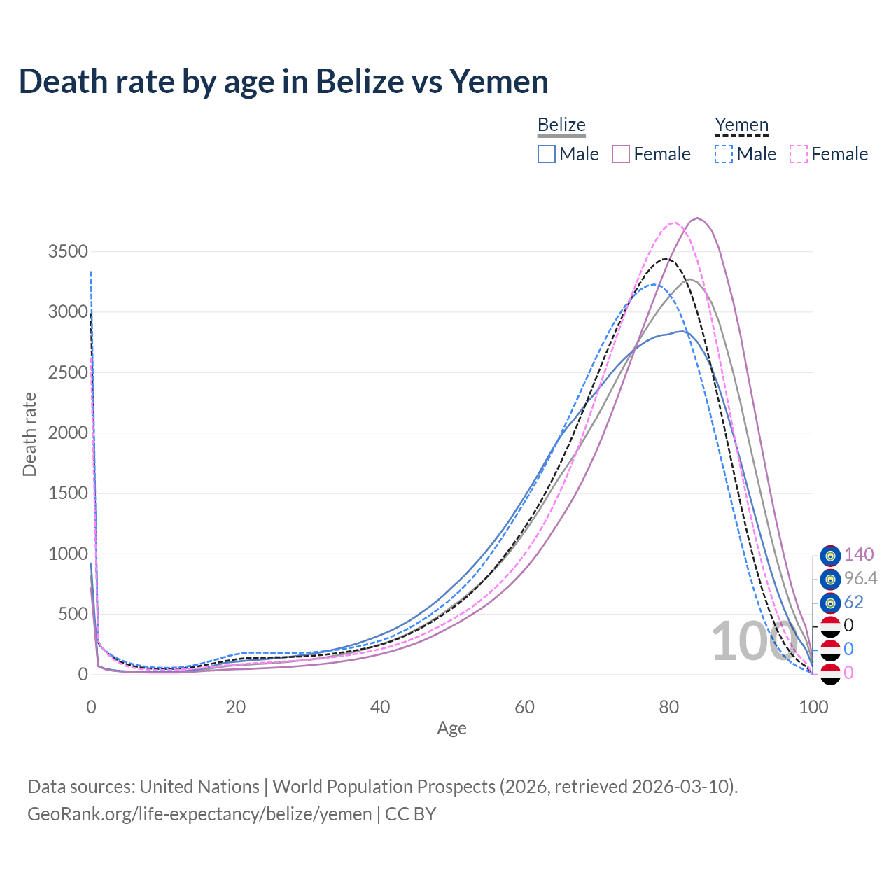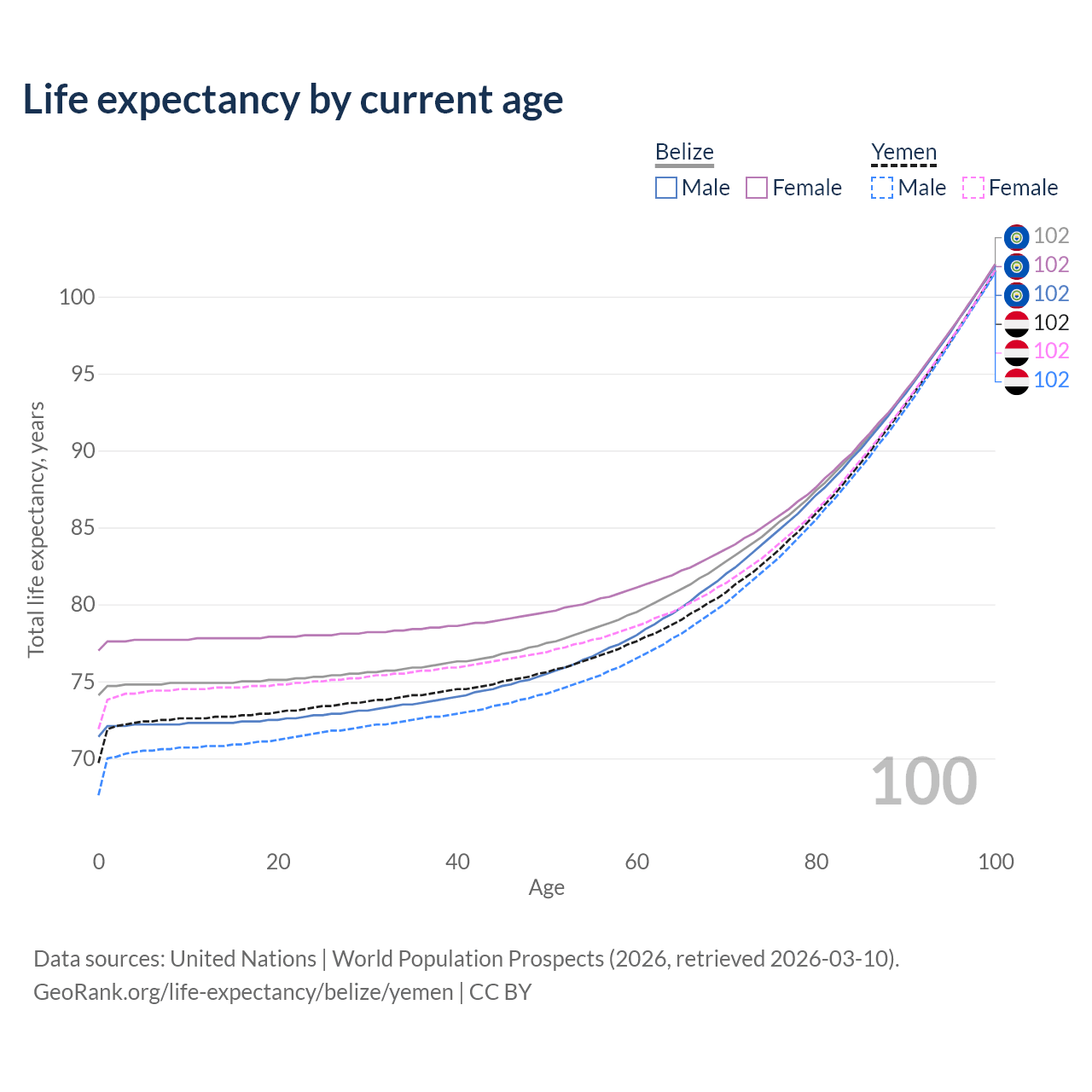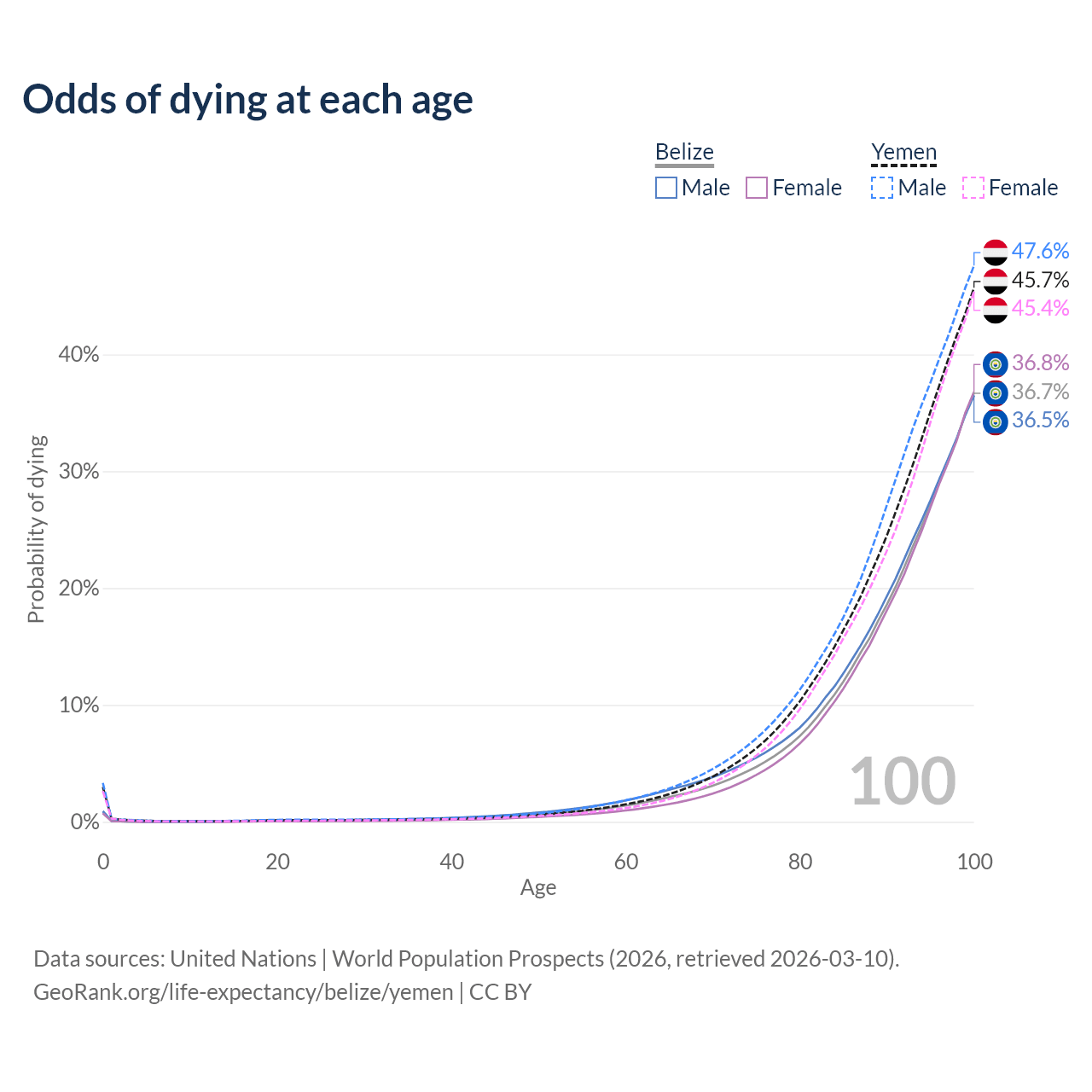 This life expectancy calculator shows the odds of living to 100, 95, 90, and below based on current age for both males and females in Belize and Yemen, along with mean and median age of death. The calculations are based on the 2026 life tables (actuarial tables) from the UN World Population Prospects.