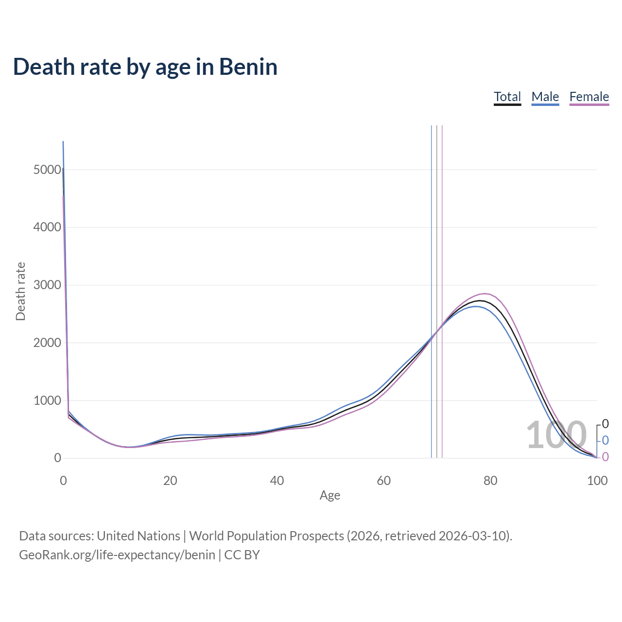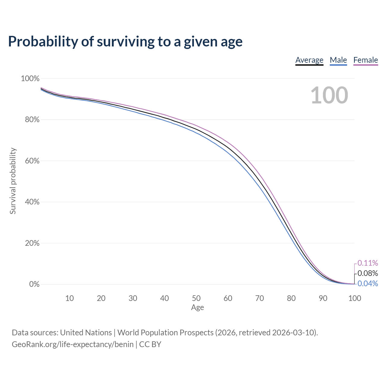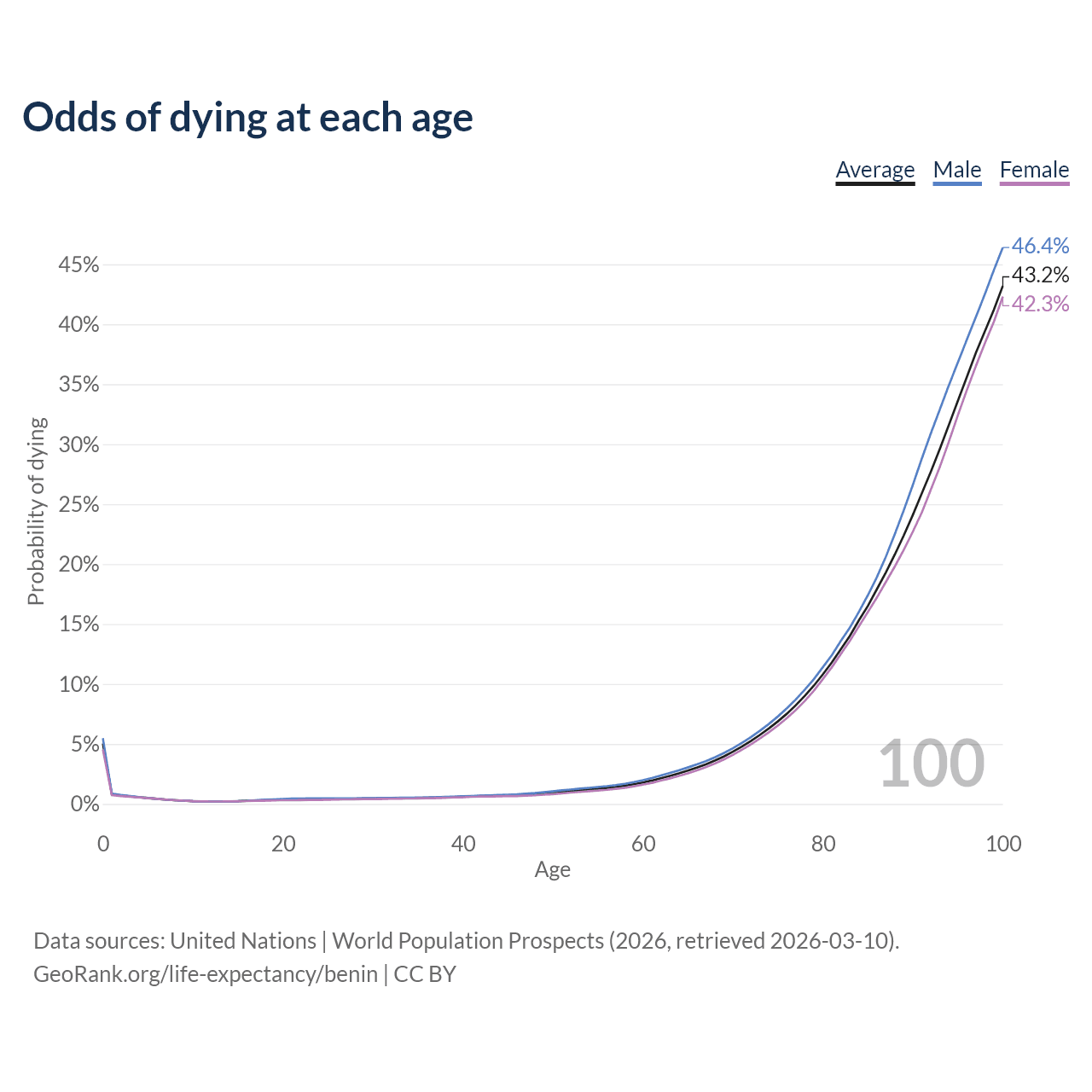 This life expectancy calculator shows the odds of living to 100, 95, 90, and below based on current age for both males and females in Benin, along with mean and median age of death. The calculations are based on the 2026 life tables (actuarial tables) from the UN World Population Prospects.